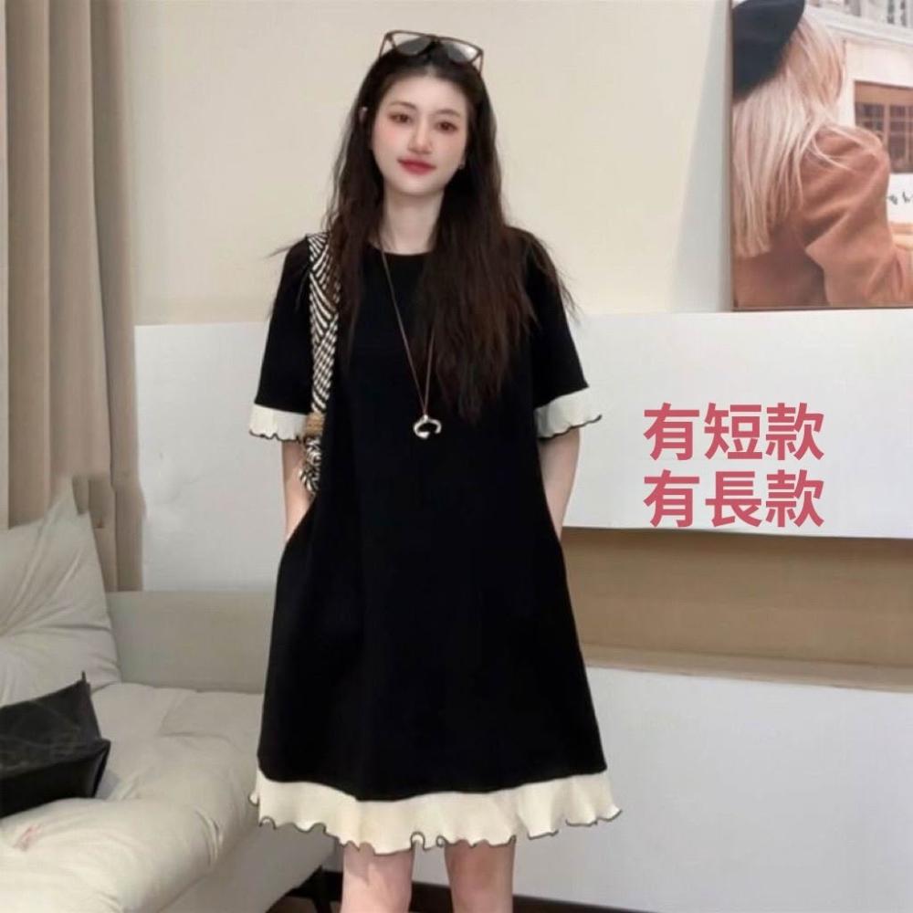 黑色蕾絲花邊短袖連衣裙女夏顯瘦收腰氣質a字長裙女