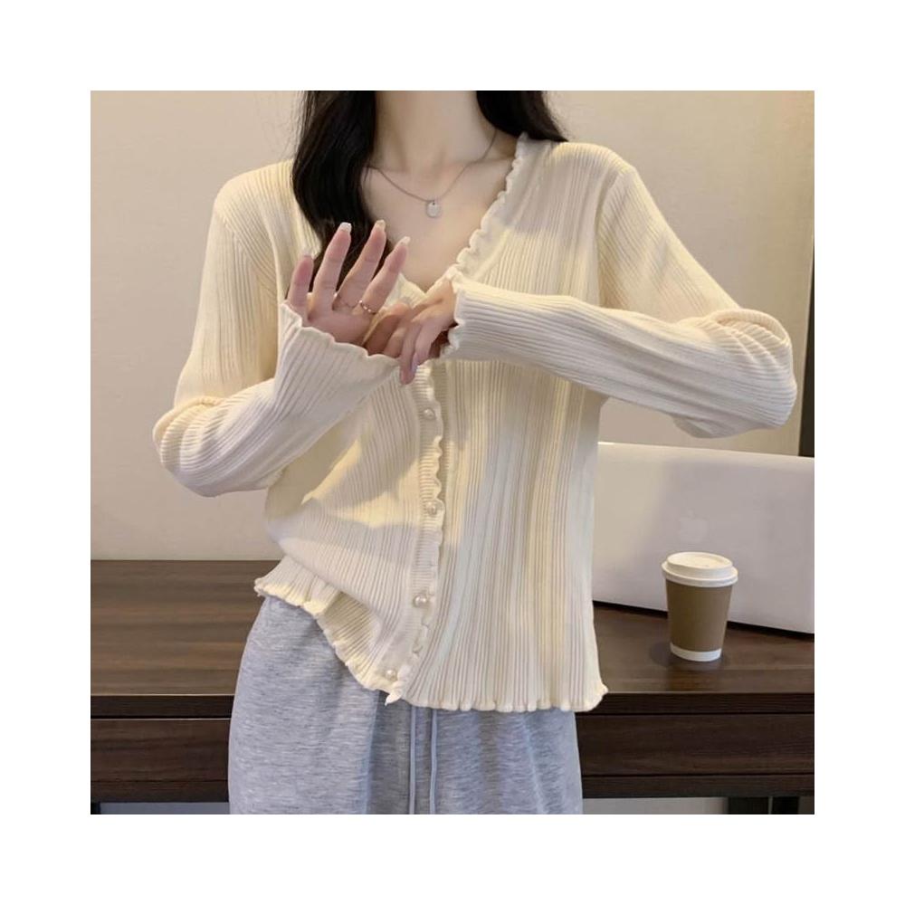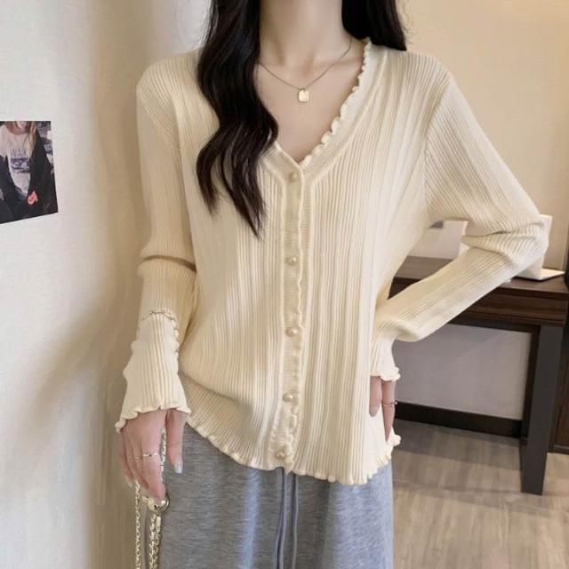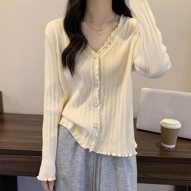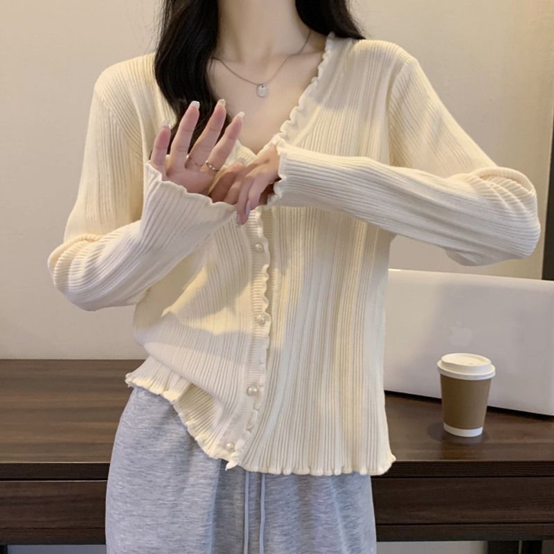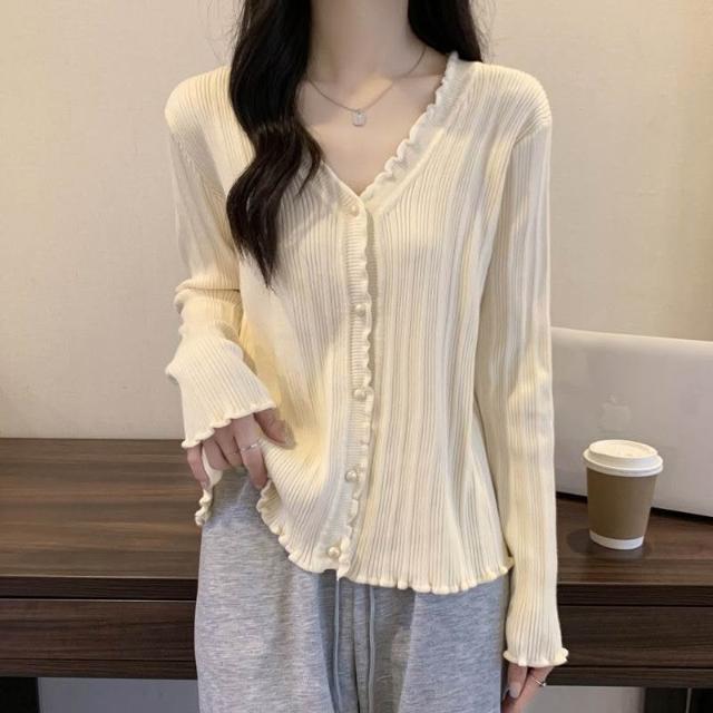女裝木耳邊設計感長袖T恤秋季新款胖m內搭打底衫V領上衣