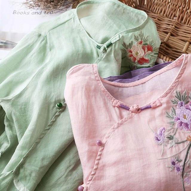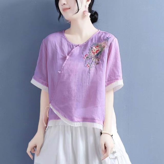 棉麻盤扣刺繡斜襟襯衫女五分袖2026夏季新款民族風不對稱半袖上衣
