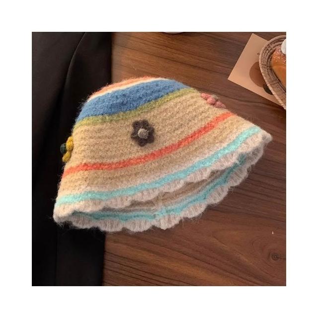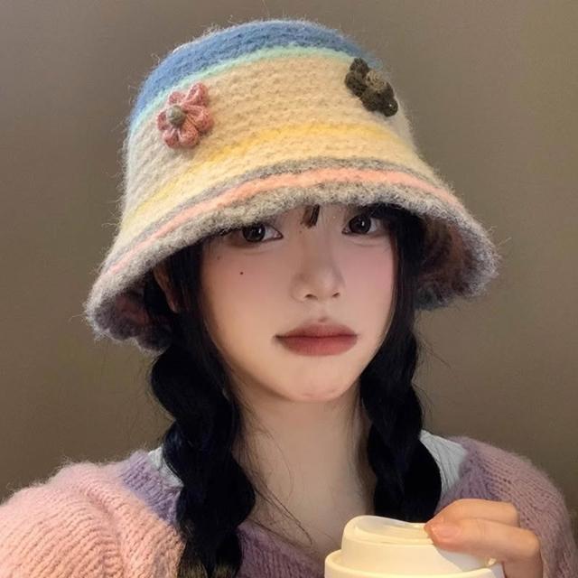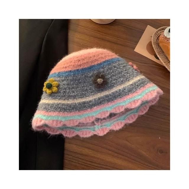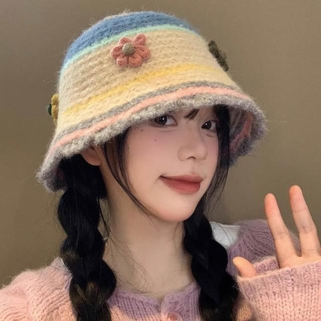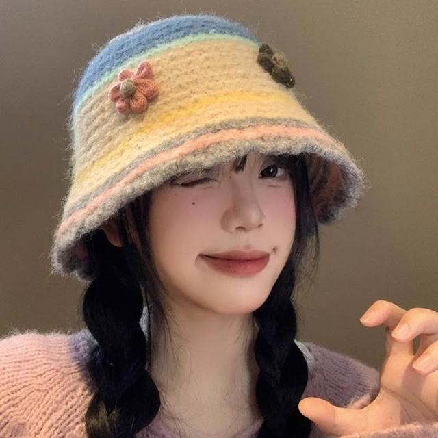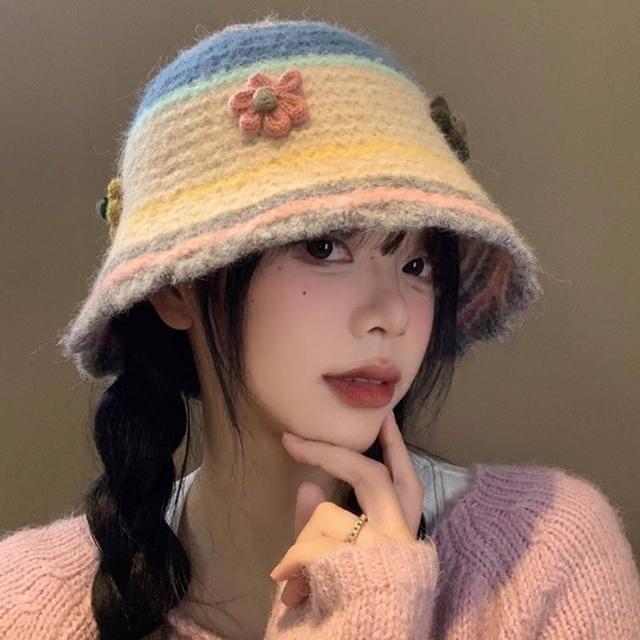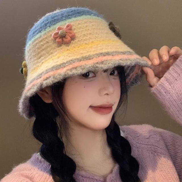 Fortune毛線帽女🌈毛綫帽女秋冬花朵手工針織漁夫帽季顯臉保暖毛綫甜美百搭編織帽子