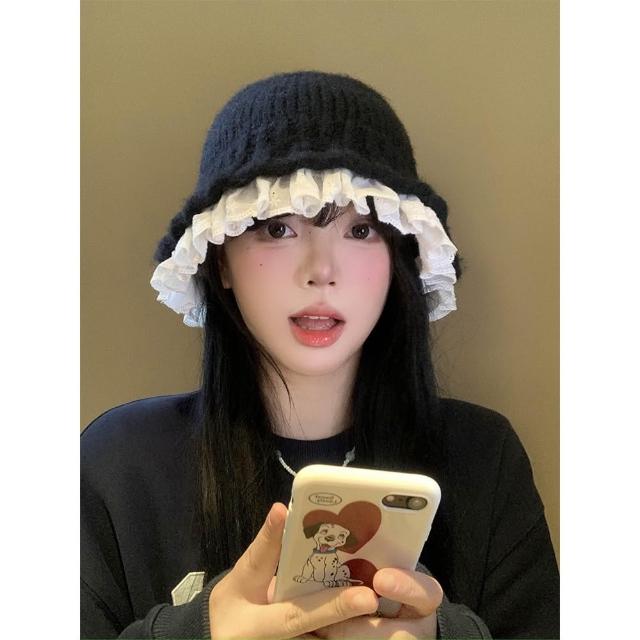 Fortune毛線帽女🌈蕾絲花邊黑色針織漁夫帽女秋冬季韓係顯臉小毛綫帽大頭圍毛絨帽子 VWBL