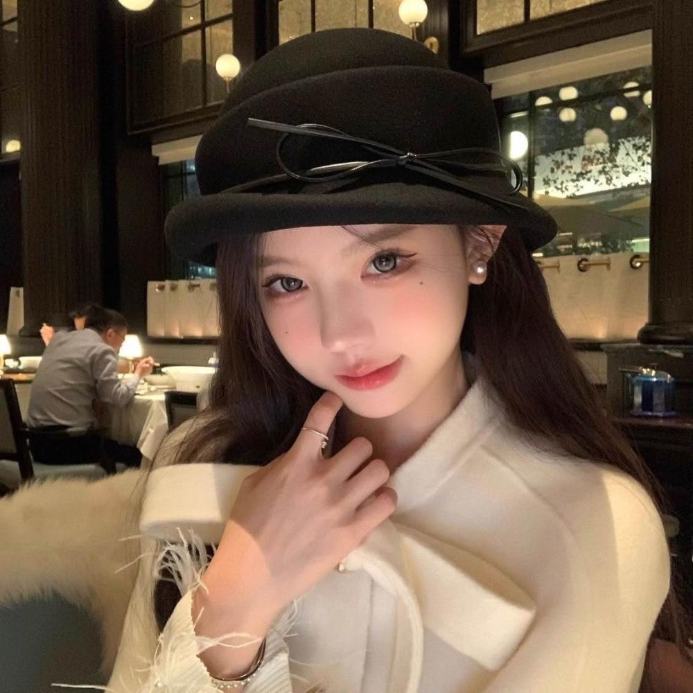 Fortune 冬日氛圍感白色蝴蝶結千金禮帽女冬季赫本風優雅氣質羊毛漁夫帽