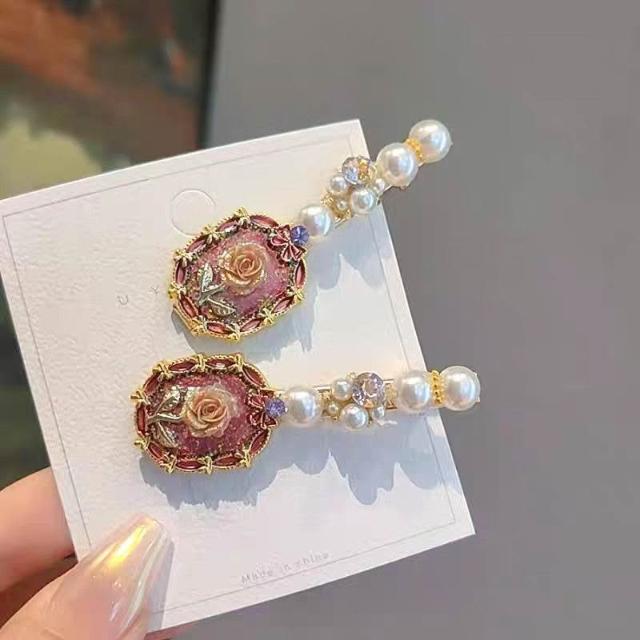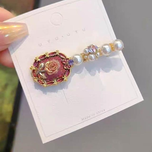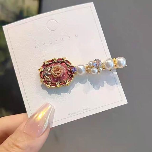 Fortune復古氣質玫瑰花珍珠髮夾側邊夾精緻花朵髮卡碎髮劉海夾鴨嘴夾髮飾