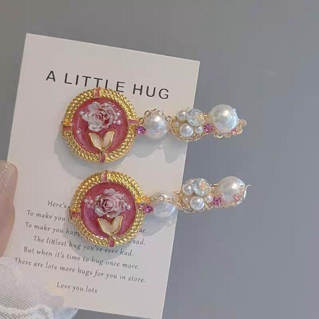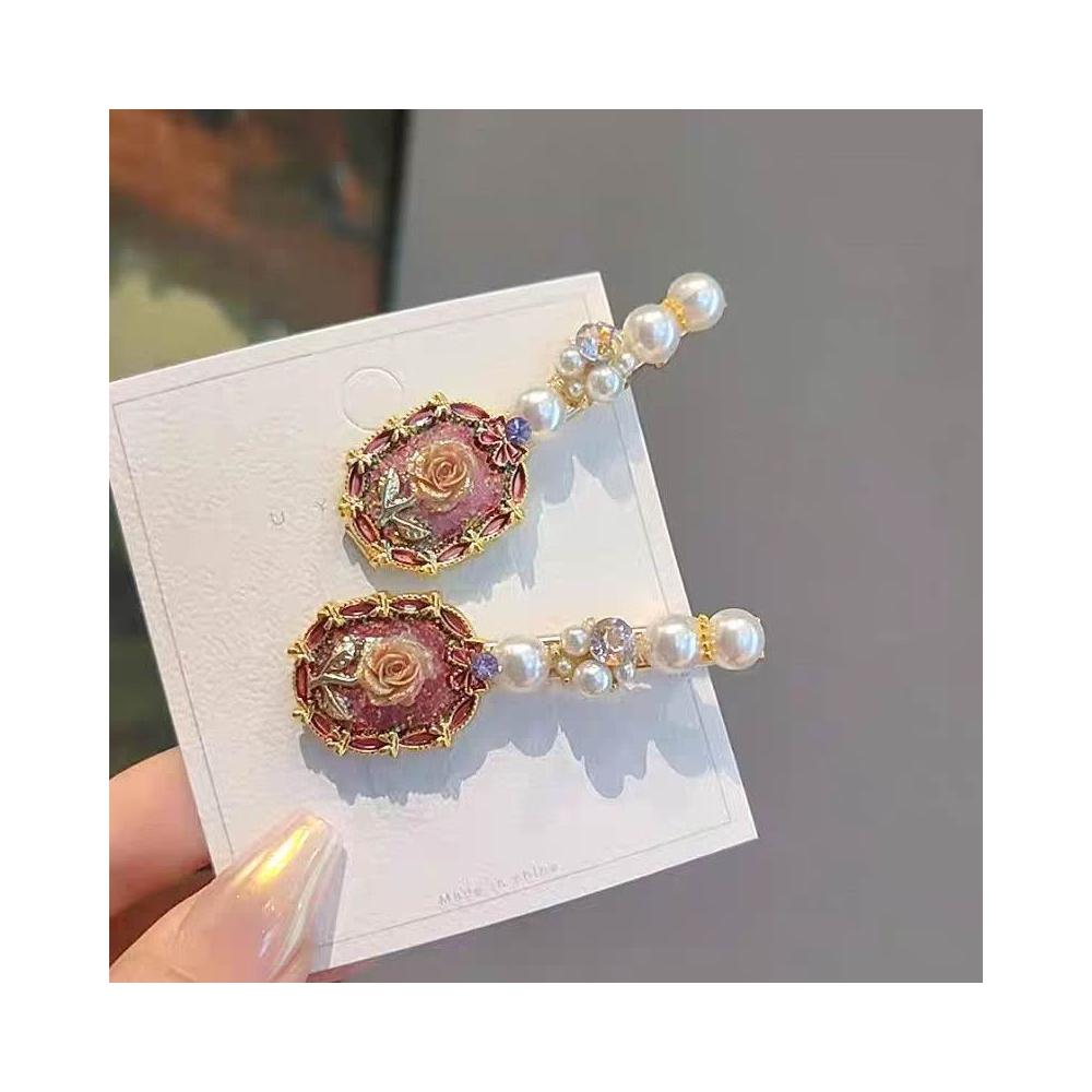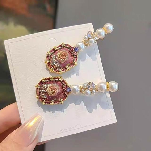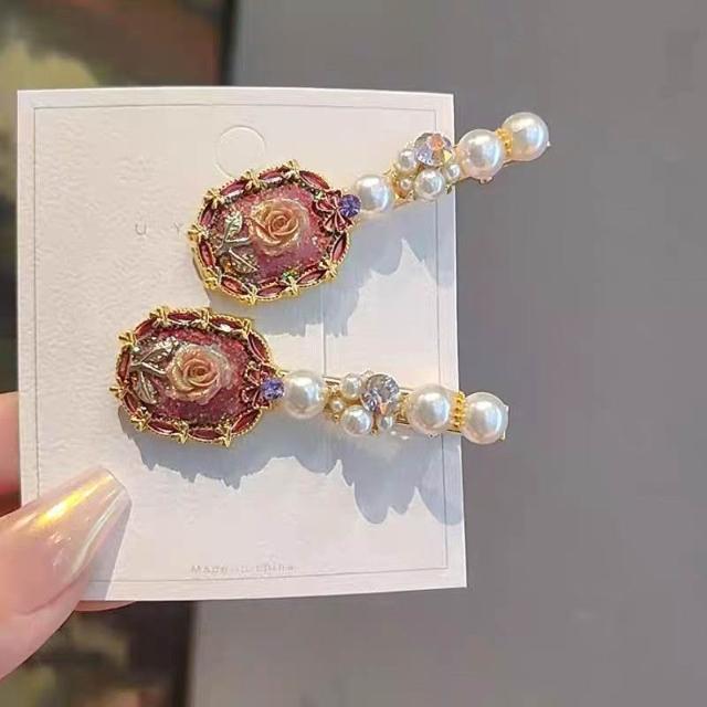 Fortune復古氣質玫瑰花珍珠髮夾側邊夾精緻花朵髮卡碎髮劉海夾鴨嘴夾髮飾