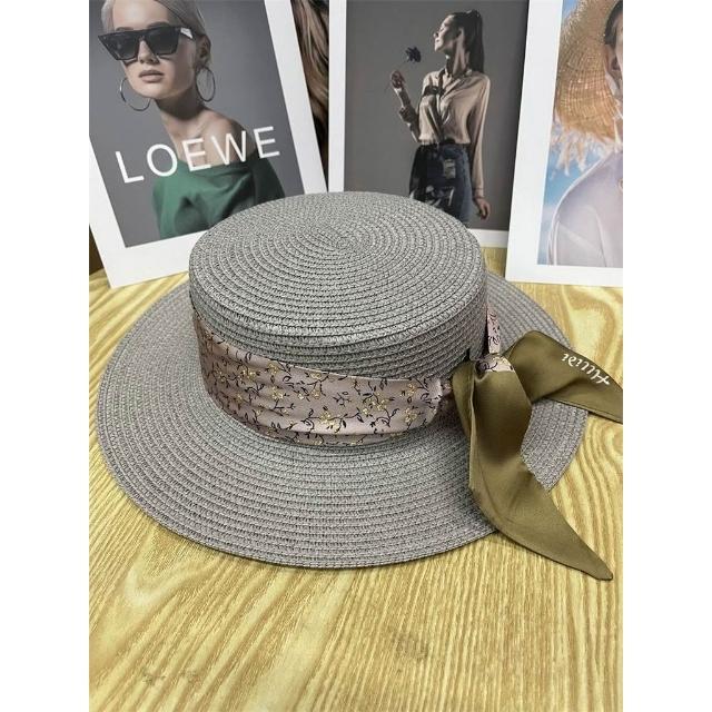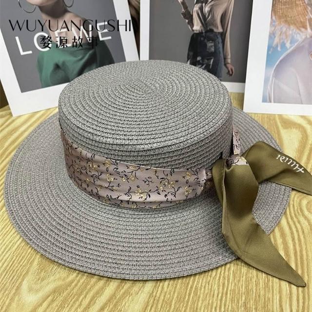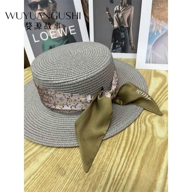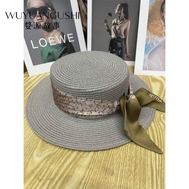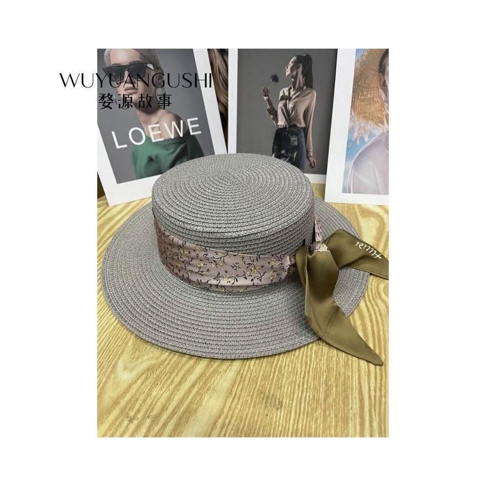 Fortune小衆灰色復古珍珠巴拿馬遮陽草帽女夏季遮陽帽平沿寬檐禮帽