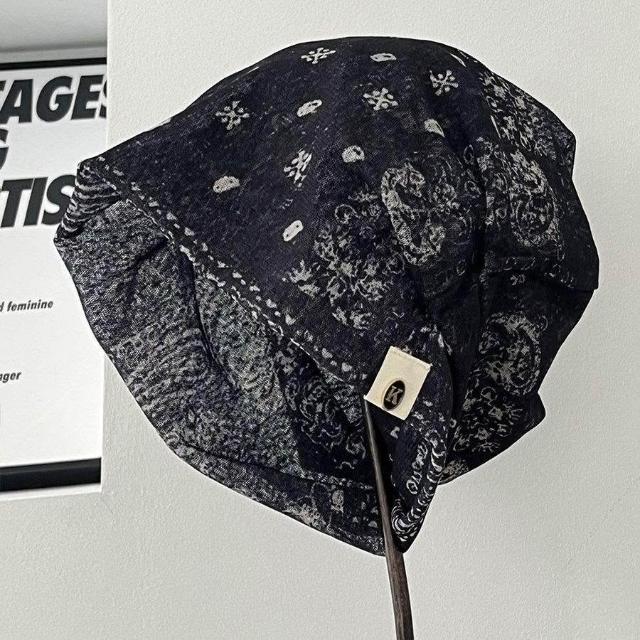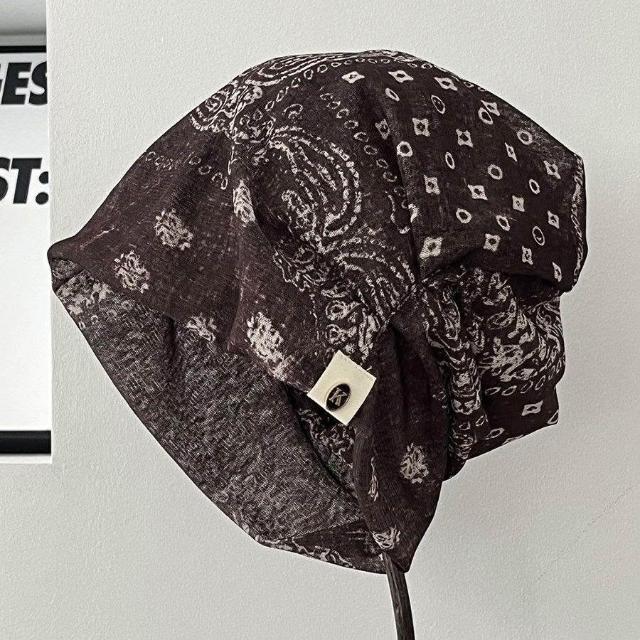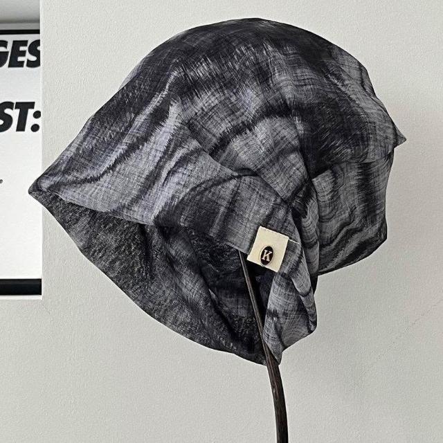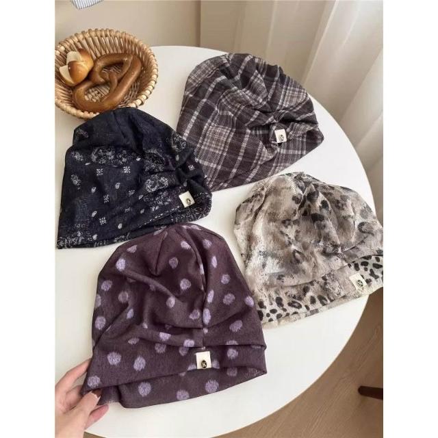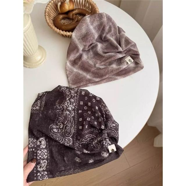 Fortune2026春夏新款復古格紋頭巾堆堆帽子女時尚拍照包頭冷帽褶皺套頭帽