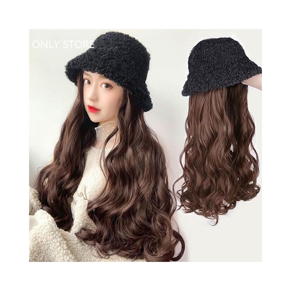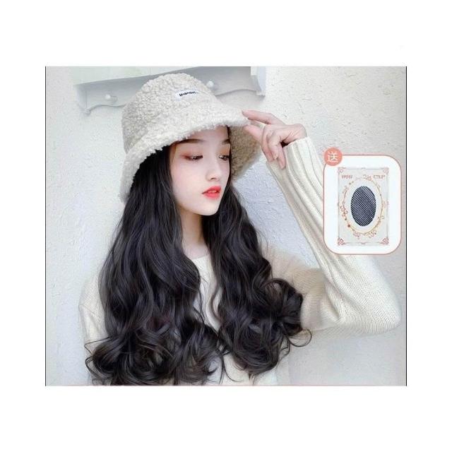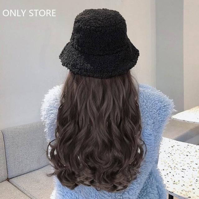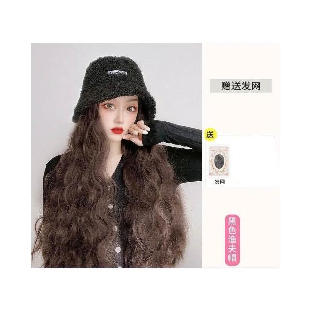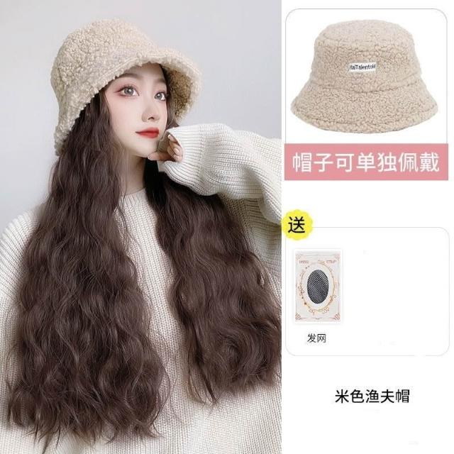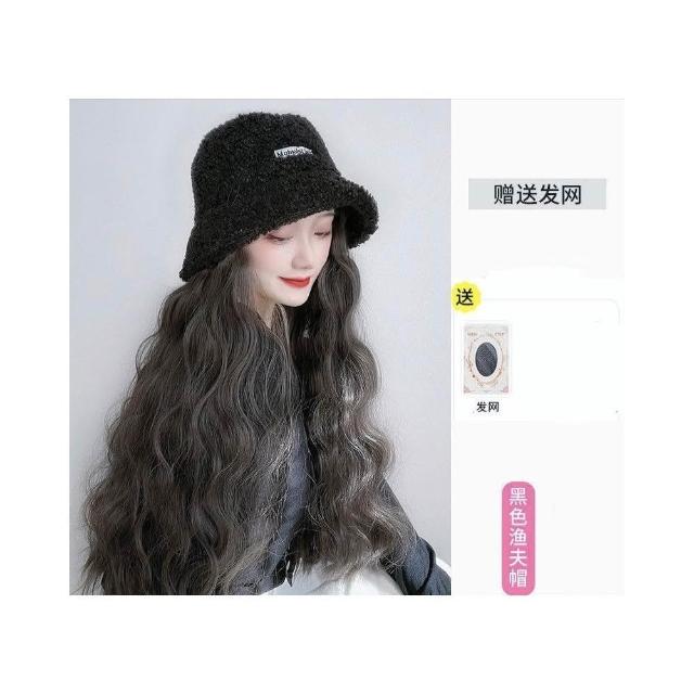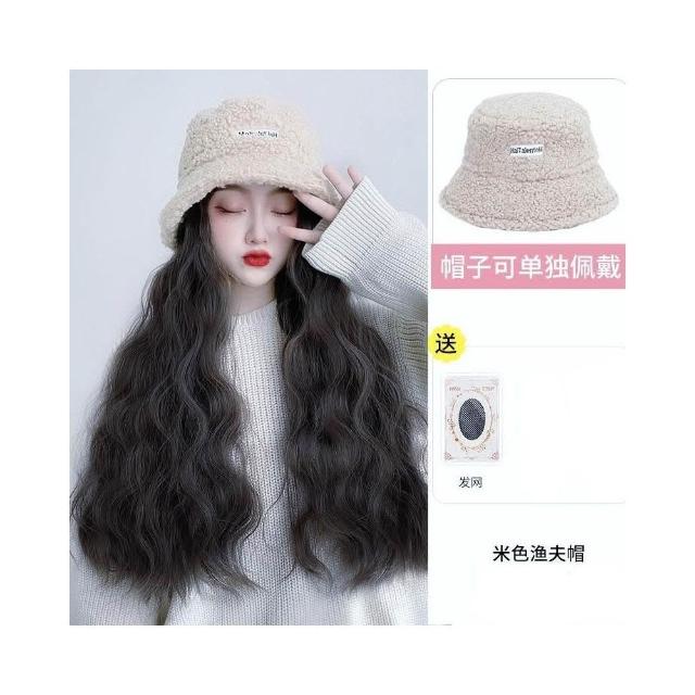 帽子假髮一件式式羔羊毛漁夫帽子女秋冬韓版時尚網紅帽帶頭髮可拆卸長捲假髮帽一件式(多色可選)
