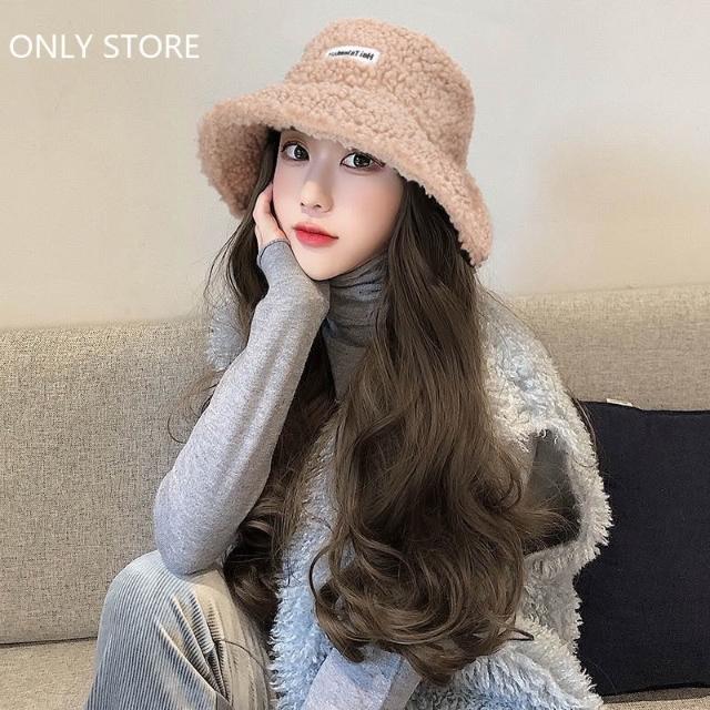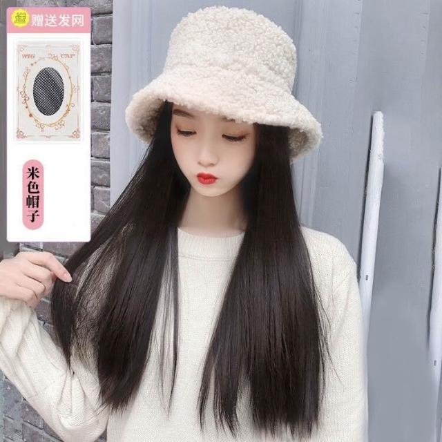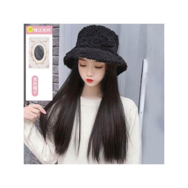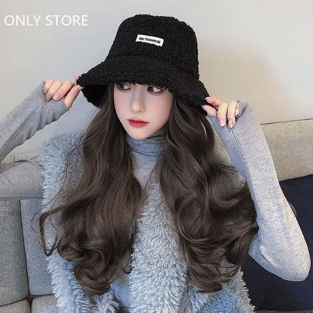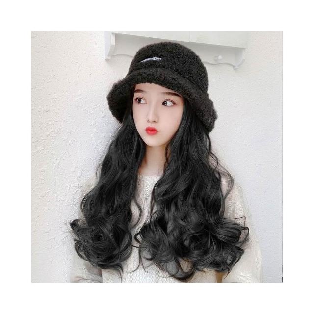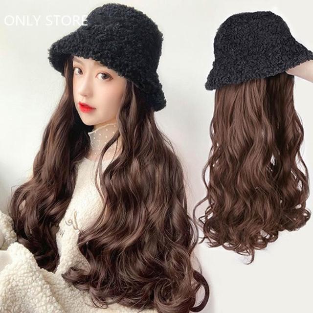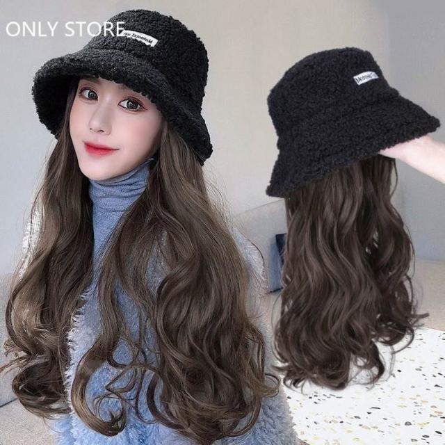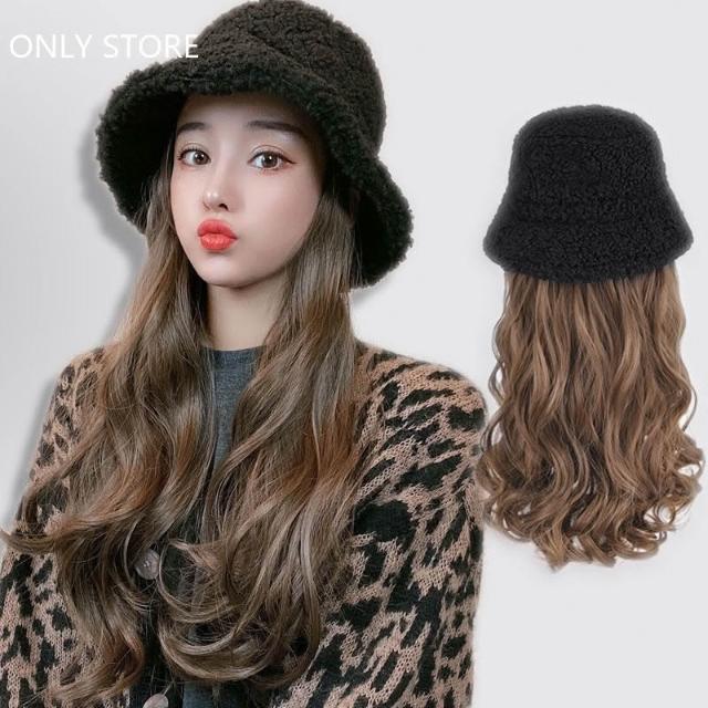帽子假髮一件式式羔羊毛漁夫帽子女秋冬韓版時尚網紅帽帶頭髮可拆卸長捲假髮帽一件式(多色可選)