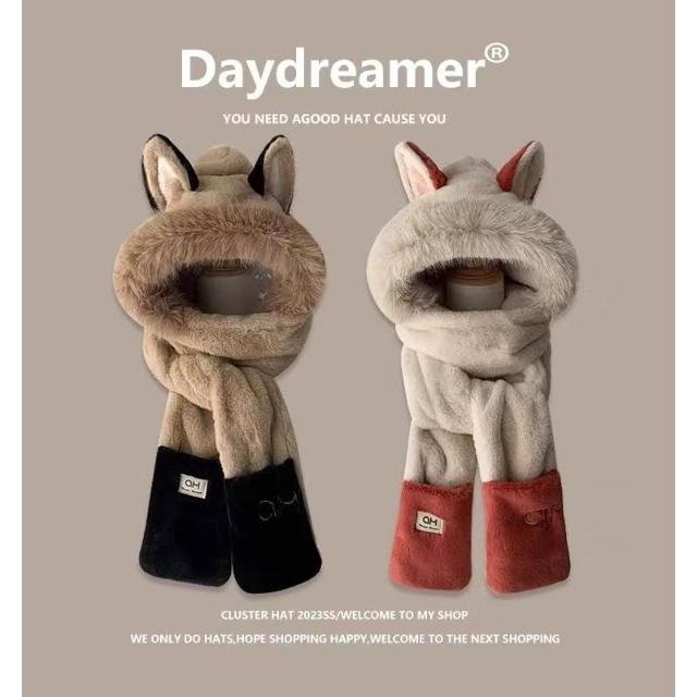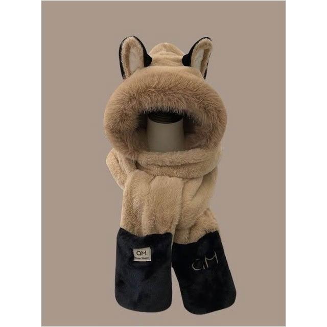 秋冬氛圍💯冬天火狐狸耳朵保暖毛茸茸滑雪圍巾手套一體帽子女加厚防寒三件套 保暖護耳包頭帽潮 毛線帽 針織帽 毛帽 大頭圍