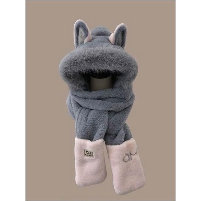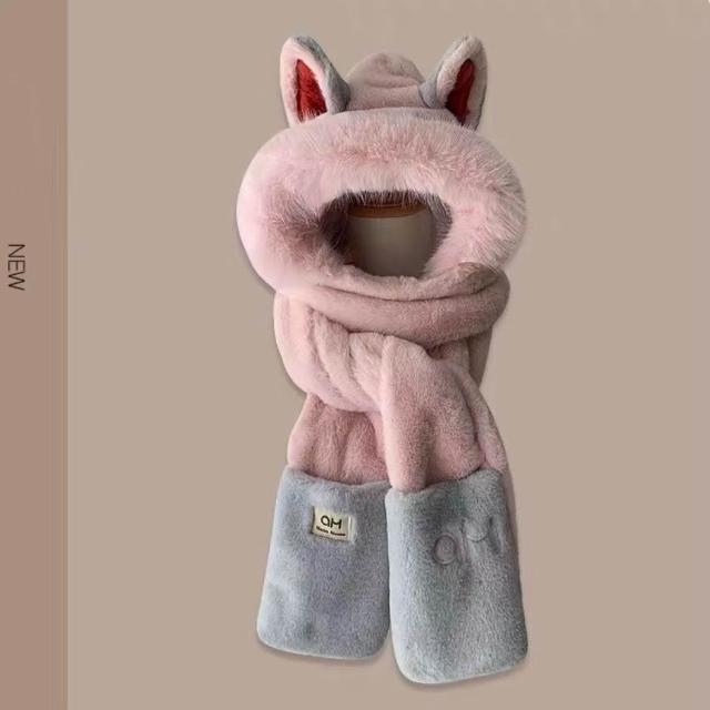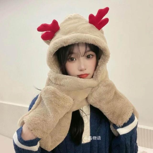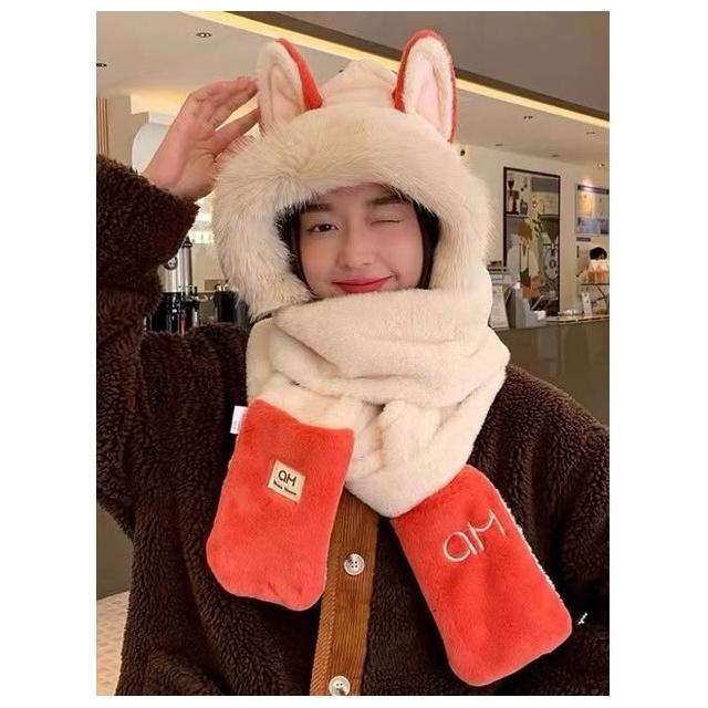 秋冬氛圍💯冬天火狐狸耳朵保暖毛茸茸滑雪圍巾手套一體帽子女加厚防寒三件套 保暖護耳包頭帽潮 毛線帽 針織帽 毛帽 大頭圍