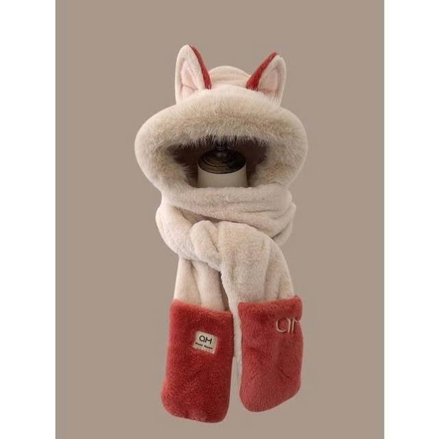 秋冬氛圍💯冬天火狐狸耳朵保暖毛茸茸滑雪圍巾手套一體帽子女加厚防寒三件套 保暖護耳包頭帽潮 毛線帽 針織帽 毛帽 大頭圍