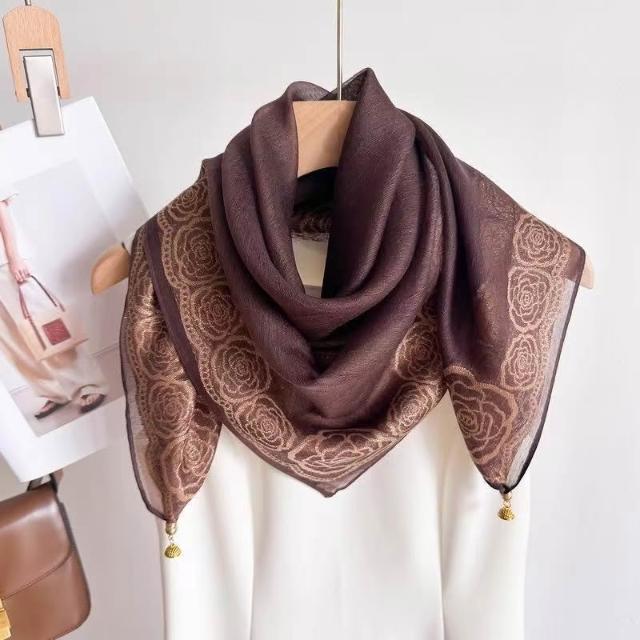 Imanchen時尚新款玫瑰花紋印花線磁扣方巾 氣質絲巾懶人圍巾洋氣百搭