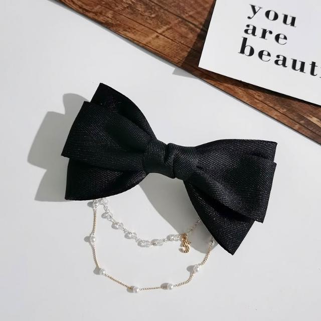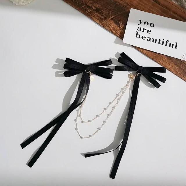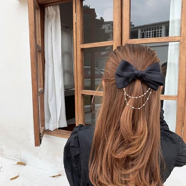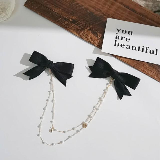 Imanchen珍珠掛墜鍊條蝴蝶結髮夾 蝴蝶結髮夾 吊墜髮夾 鍊條對夾 對夾 鴨嘴夾 髮夾 髮飾