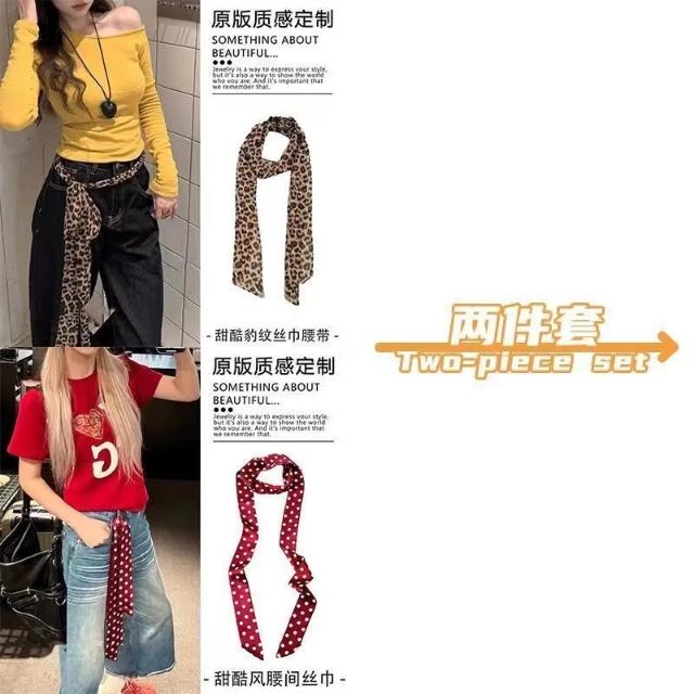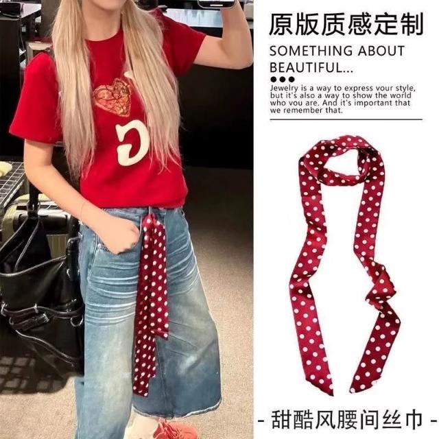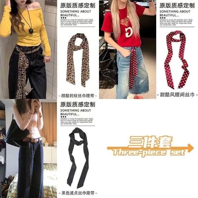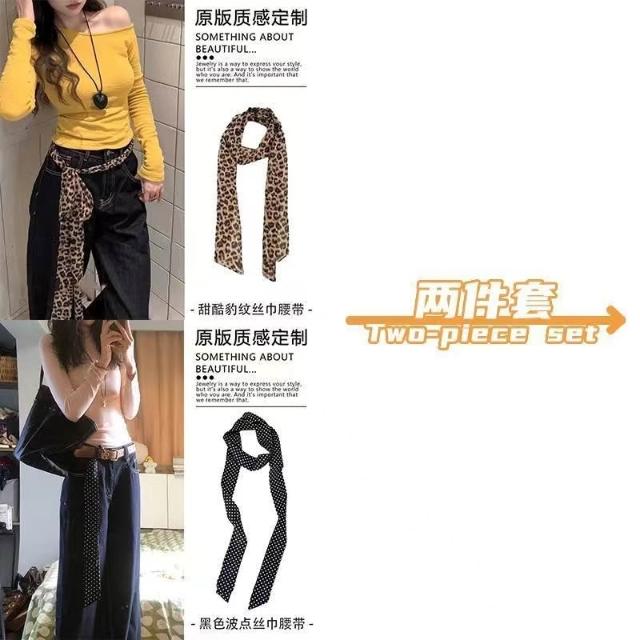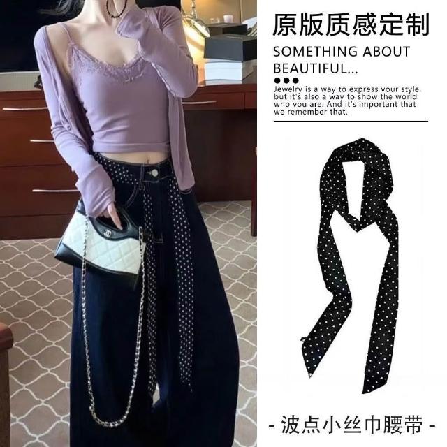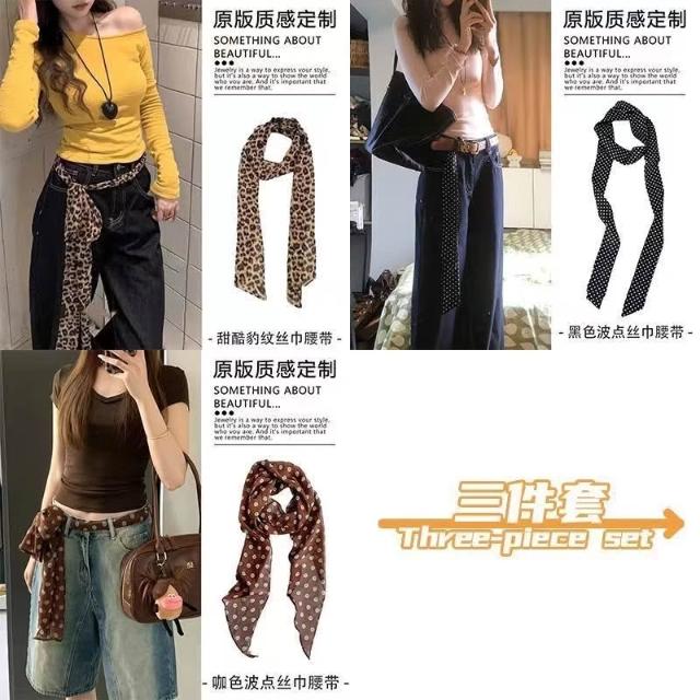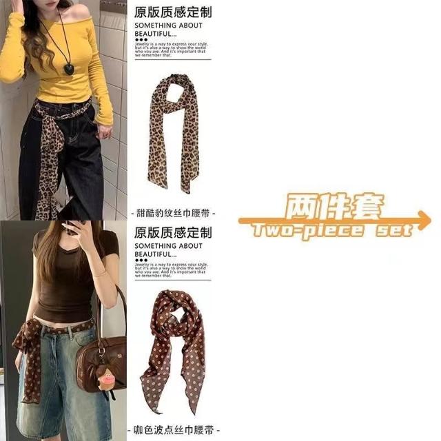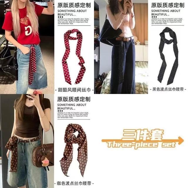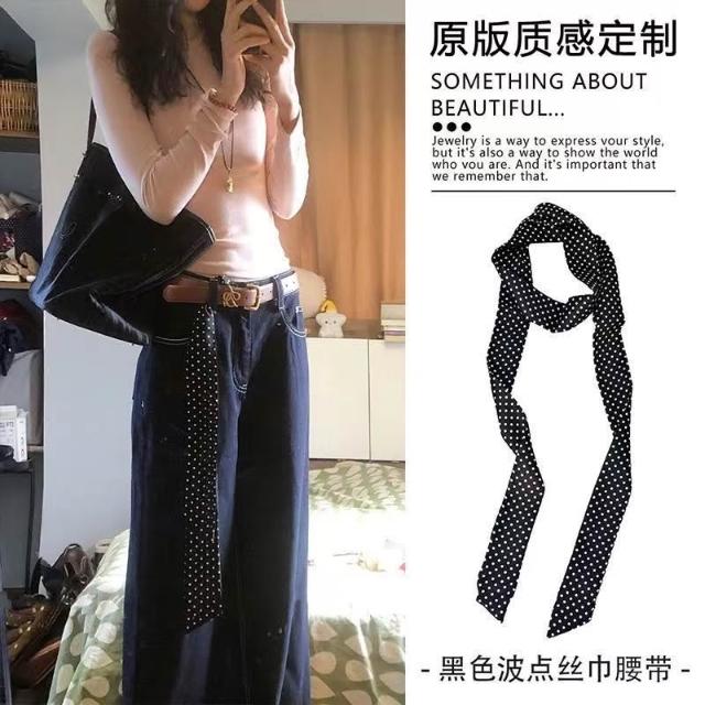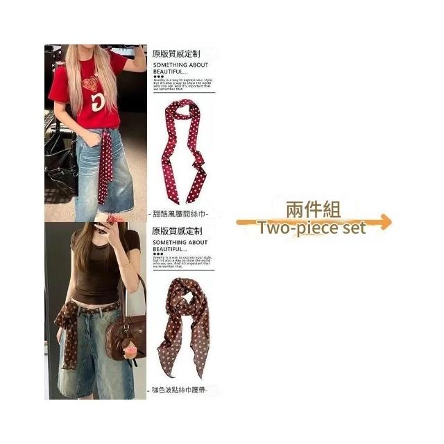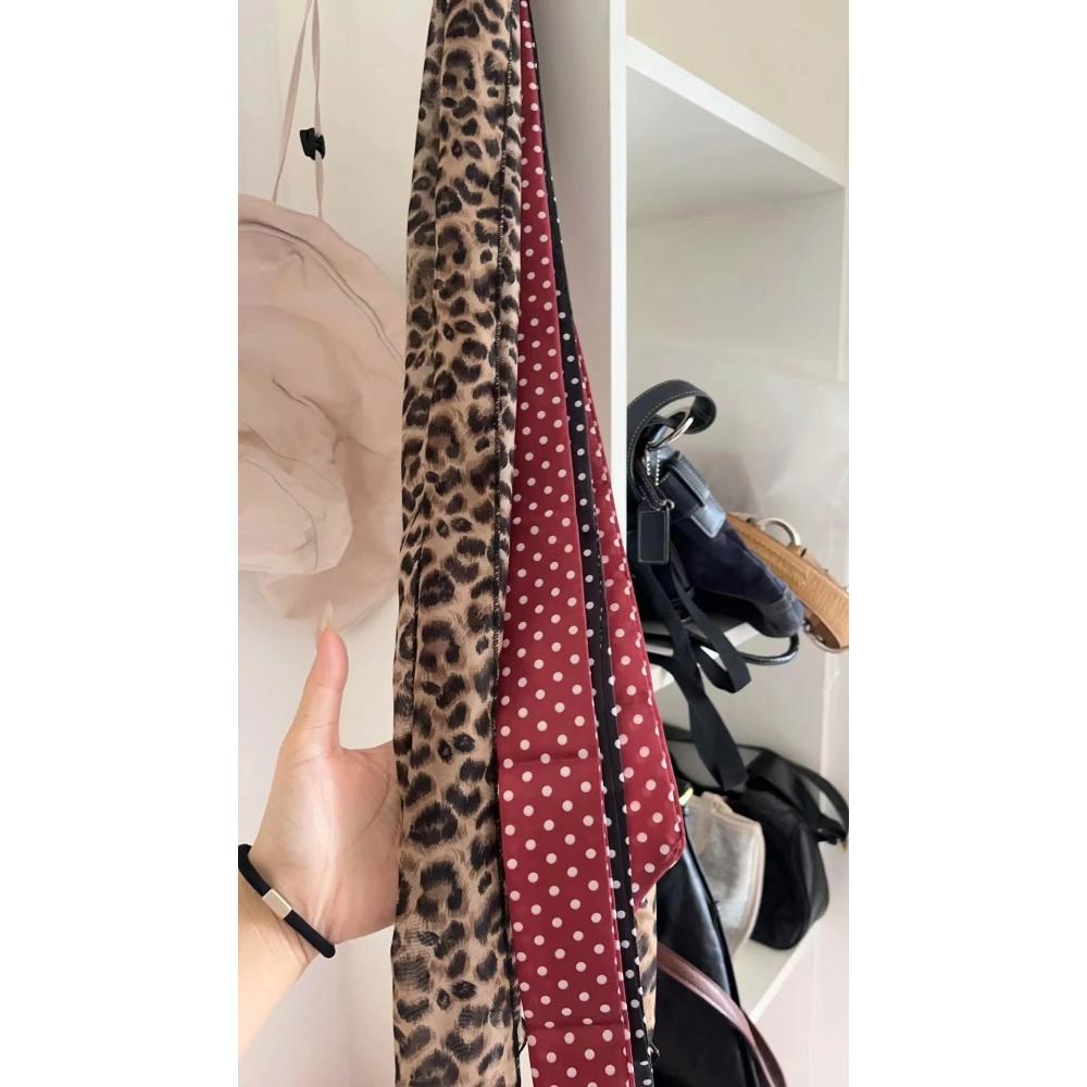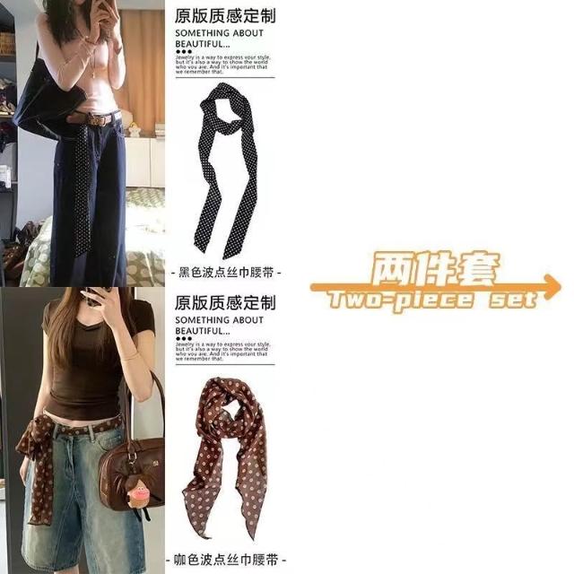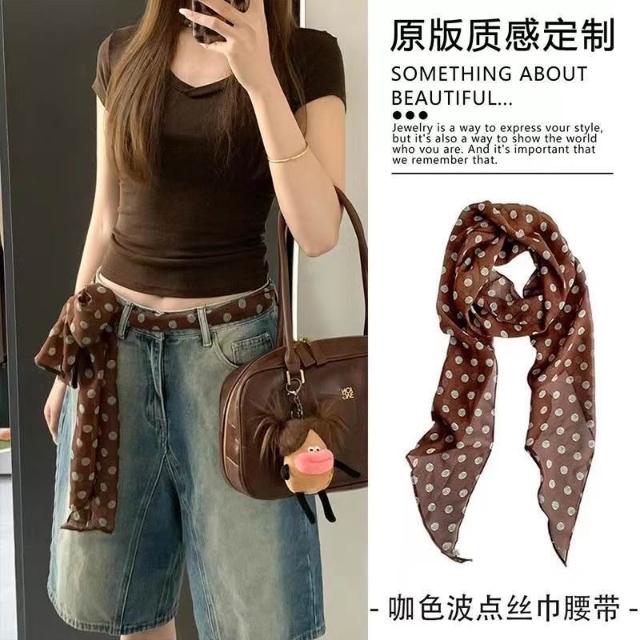 復古咖色波點絲巾腰帶女配牛仔褲長條紗巾絲帶裝飾腰鏈腰飾配飾品(腰帶 圍脖多種用法 網紅潮流)