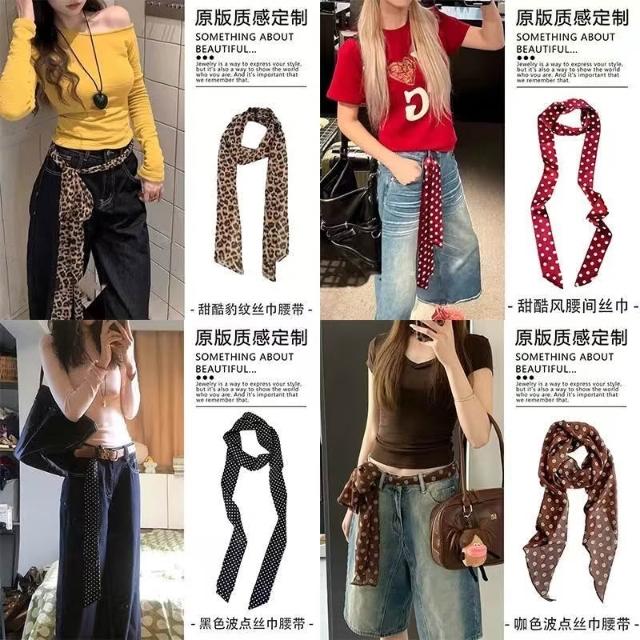 復古咖色波點絲巾腰帶女配牛仔褲長條紗巾絲帶裝飾腰鏈腰飾配飾品(腰帶 圍脖多種用法 網紅潮流)