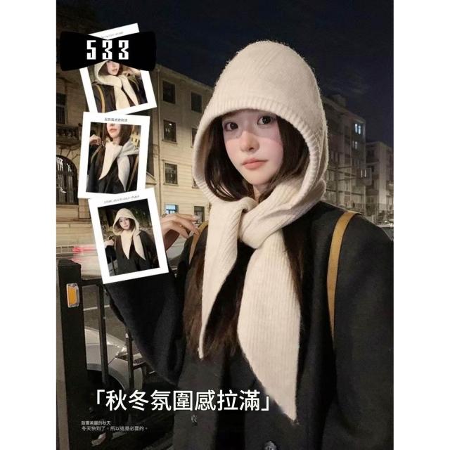 Imanchen抖音爆款灰色巴拉克拉法帽女秋冬保暖毛線帽圍巾一體連帽圍脖針織帽