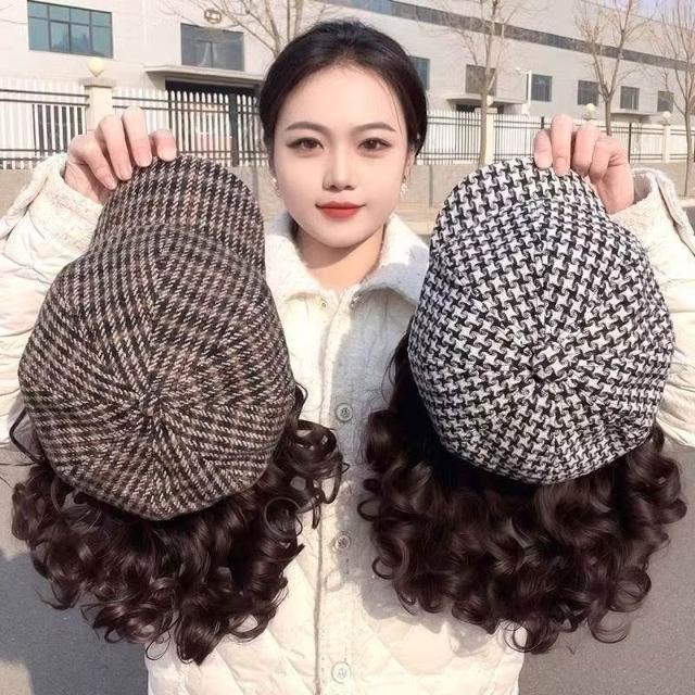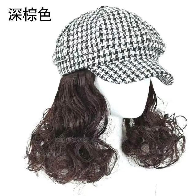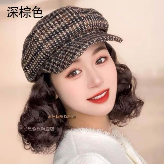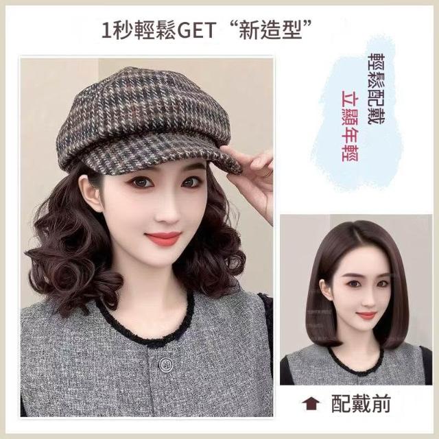 Imanchen帽子假髮秋冬新媽媽髮短捲髮千鳥格八角帽慵懶氣質全頭套假髮帽