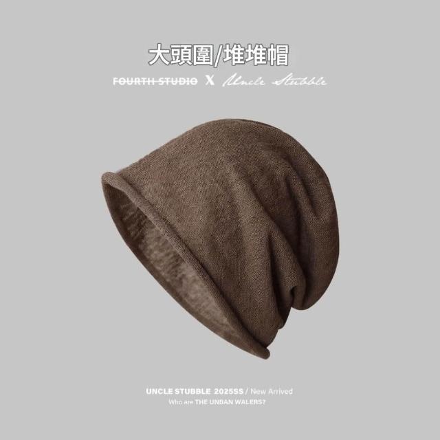 Imanchen亞麻透氣堆堆帽男女大頭圍寬鬆套頭帽純色百搭卷邊冷帽包頭帽薄款