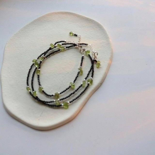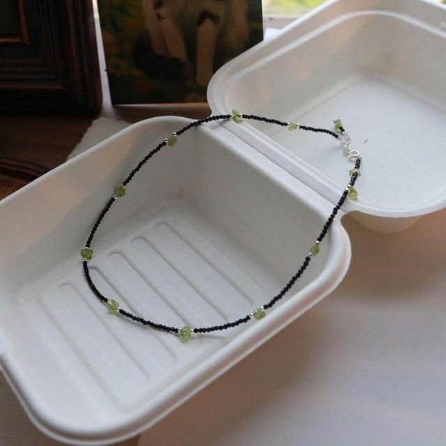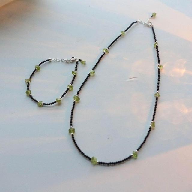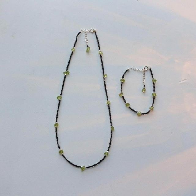 Imanchen黑尖晶搭配橄欖石碎石項鍊鎖骨項鍊手鍊套裝霸氣波西米亞風