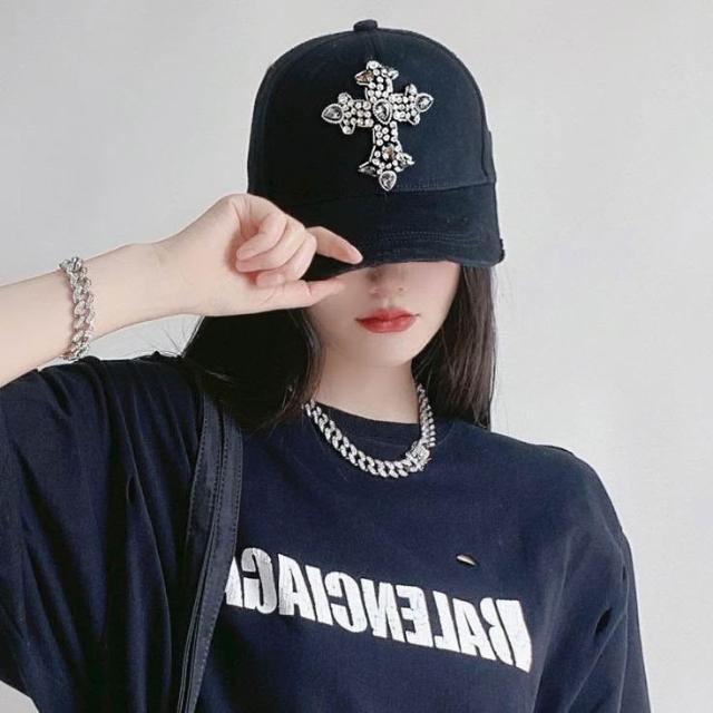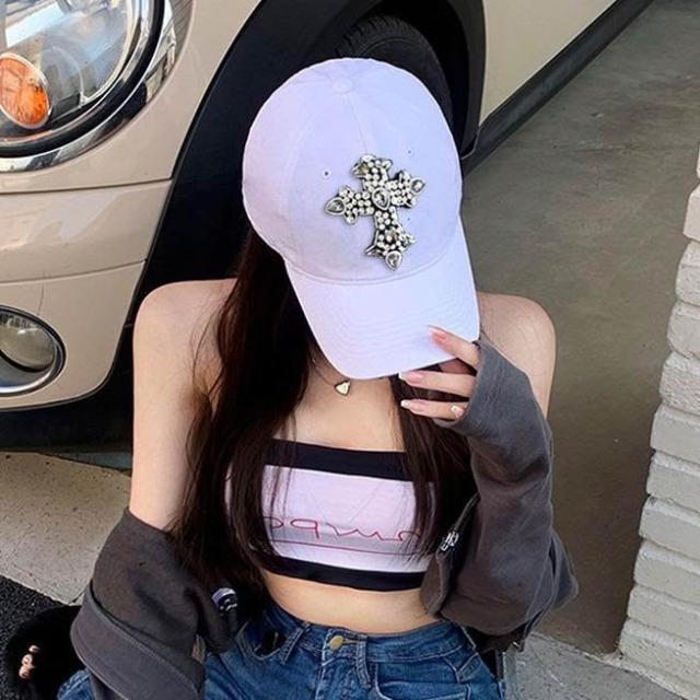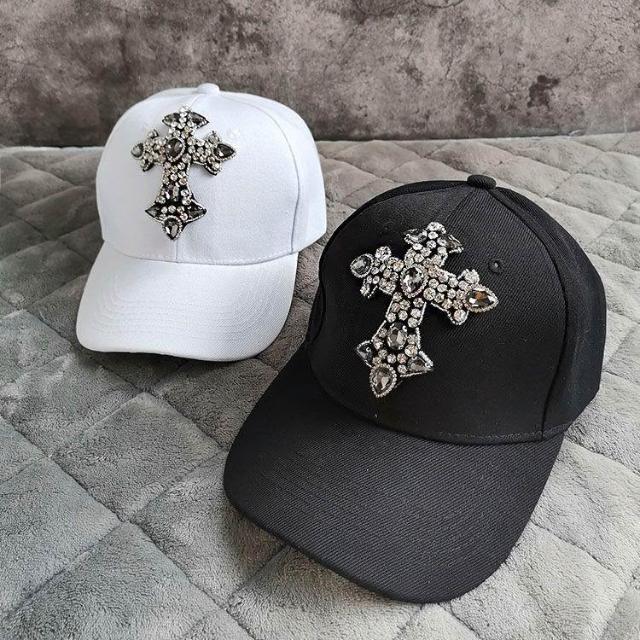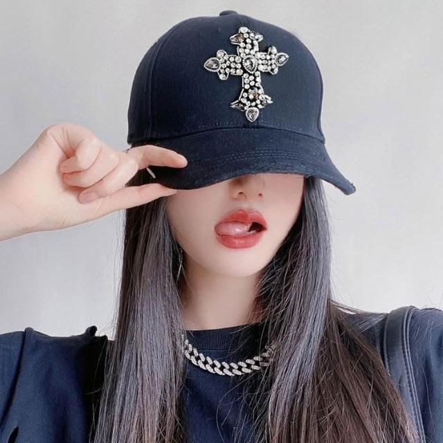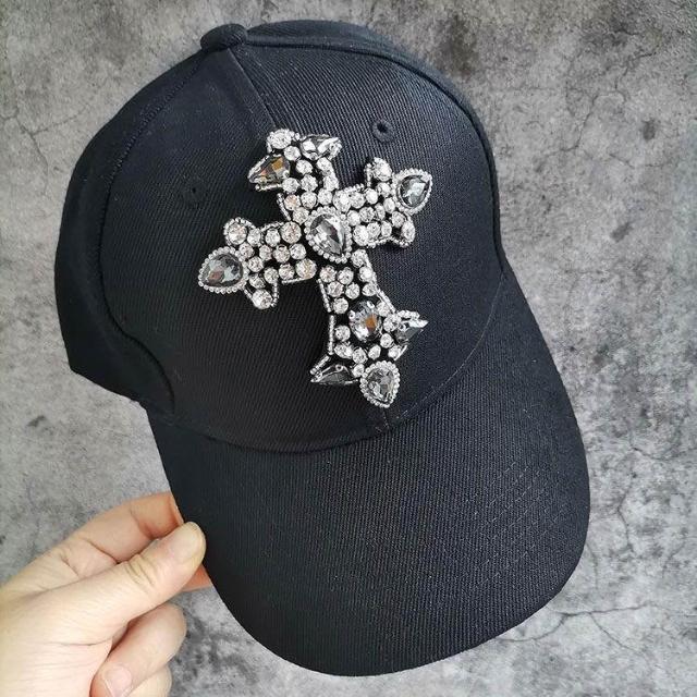 Imanchen閃亮水鑽寶石十字架潮牌棒球帽防曬遮陽帽子夏男女時尚硬頂鴨舌帽