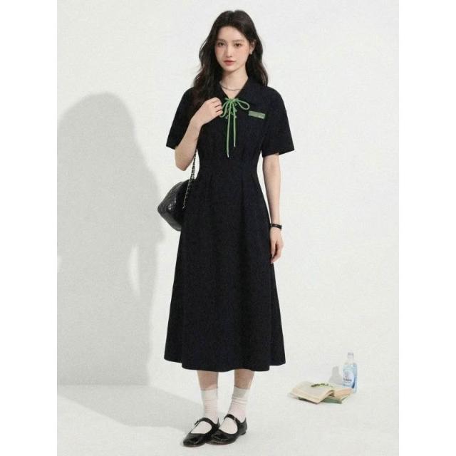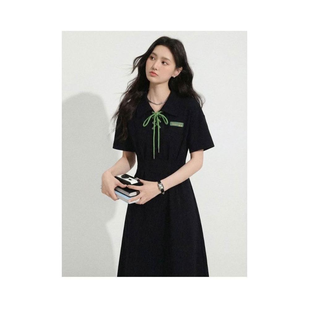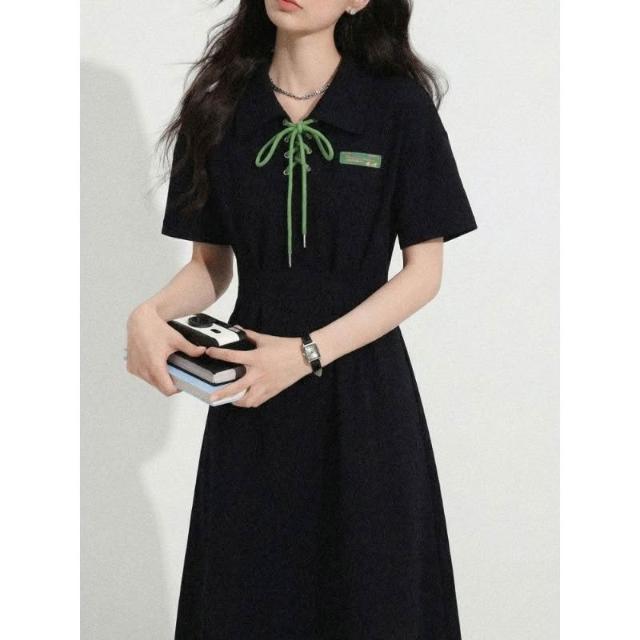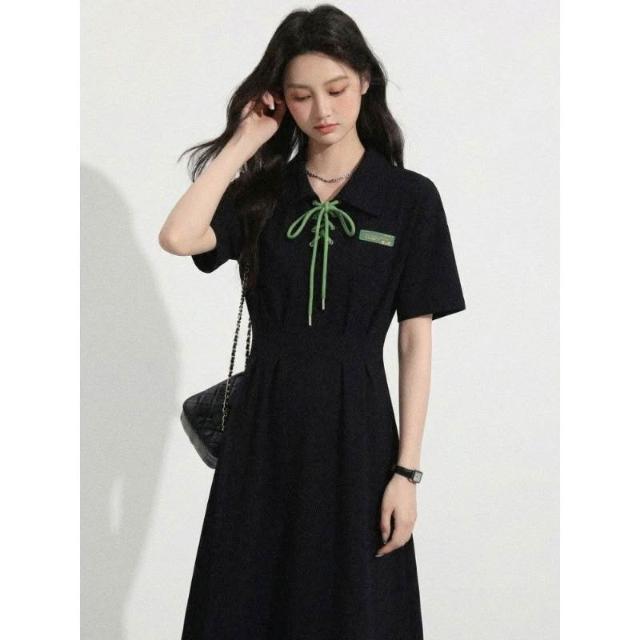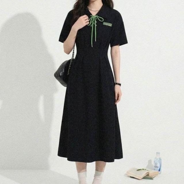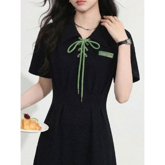 Dream Life-好物集長裙 夏季新款 黑色綁帶連衣裙 女裝 Polo領學院風 大碼顯瘦 短袖長裙