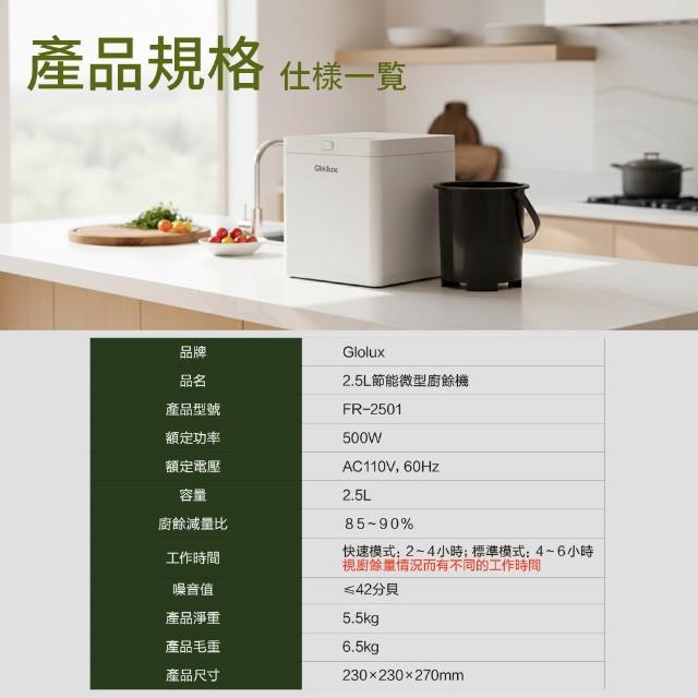Glolux 2.5L節能微型廚餘機 FR-2501符合政府補助 廚餘桶除臭環保 廚餘減量 納米陶瓷塗層 高溫烘乾