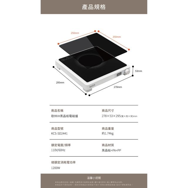 Kolin 歌林IH黑晶面板電磁爐(KCS-SD2441)1200瓦加熱快/好清理/一鍵飛梭控溫,好操作