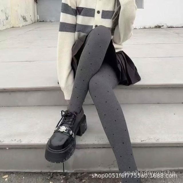 波點植絨連褲襪春秋冬加厚外穿中灰色女豎條紋顯瘦保暖打底襪絲襪