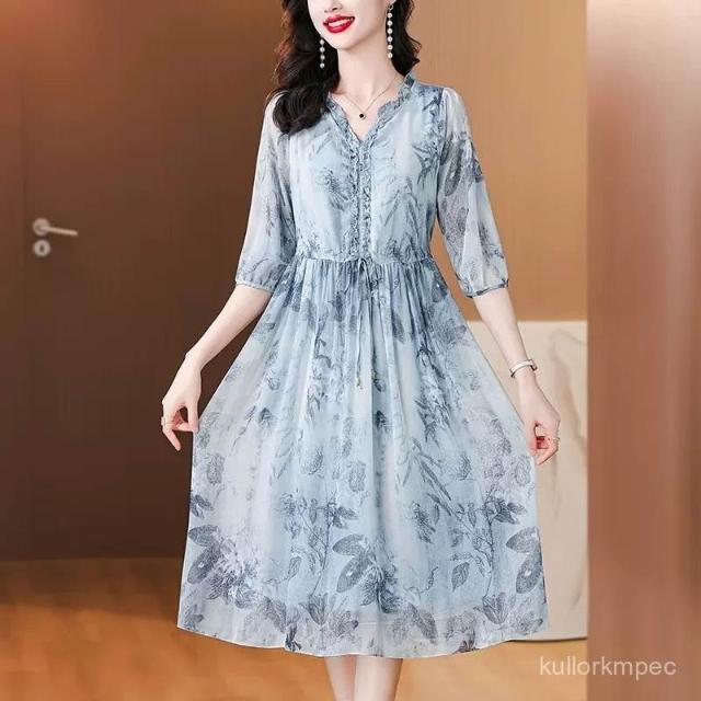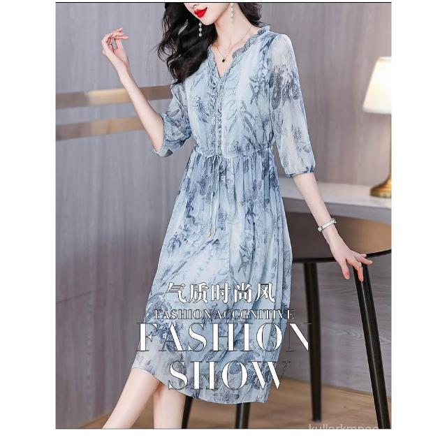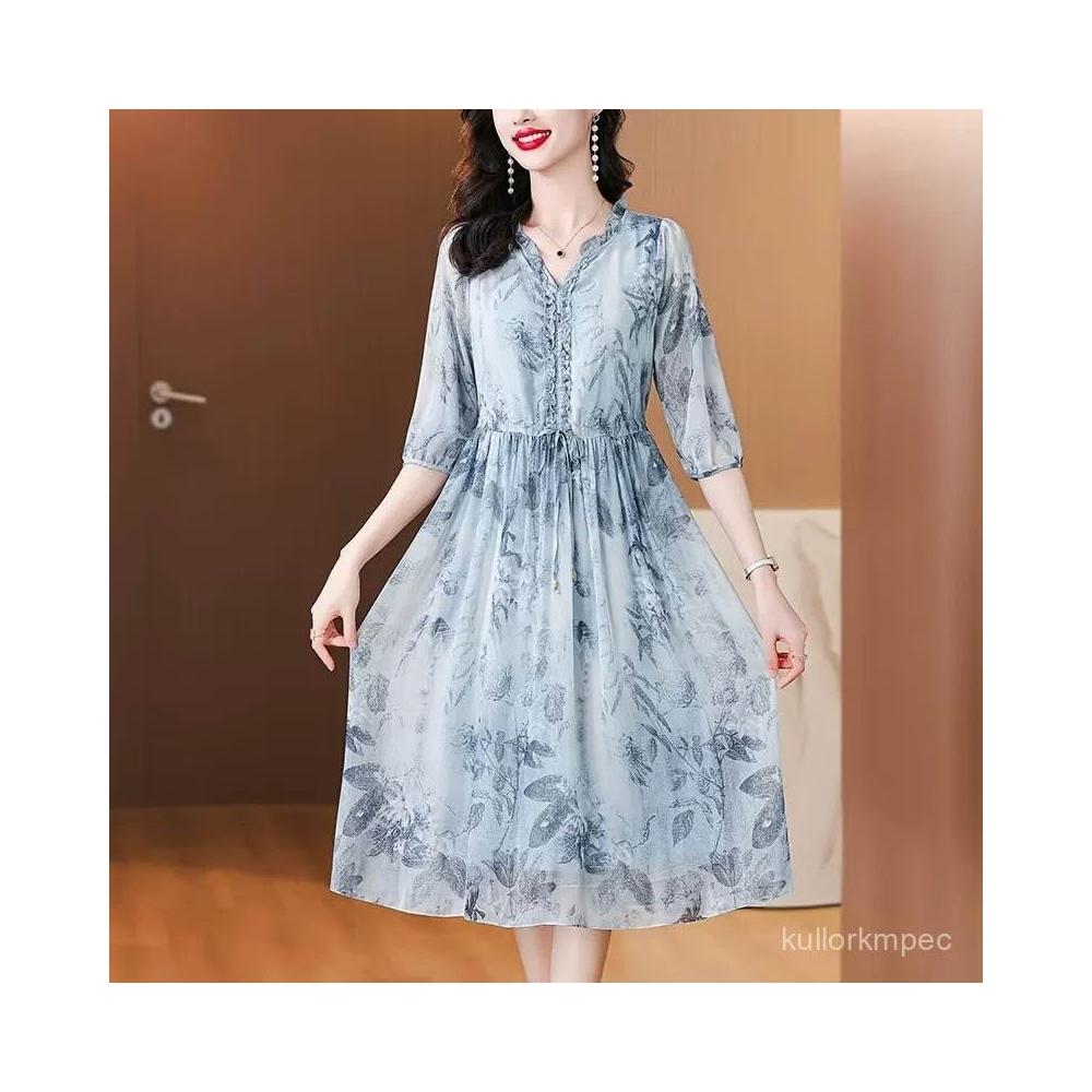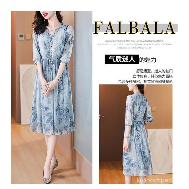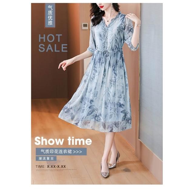 浩浩甄選 碎花連衣裙女2024春秋新款高腰媽媽洋氣減齡寬鬆遮肚中長款裙子女