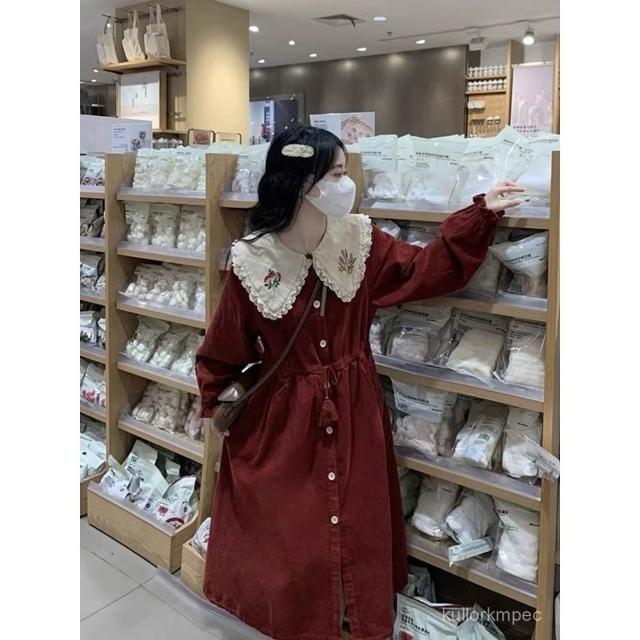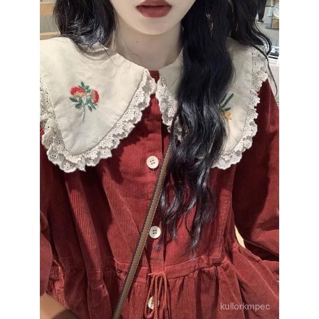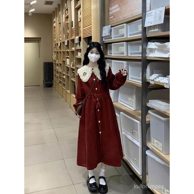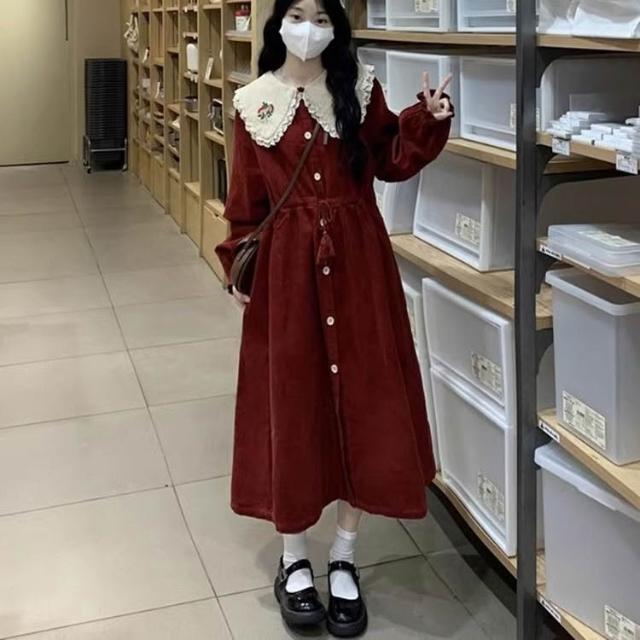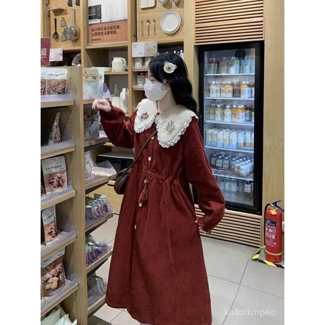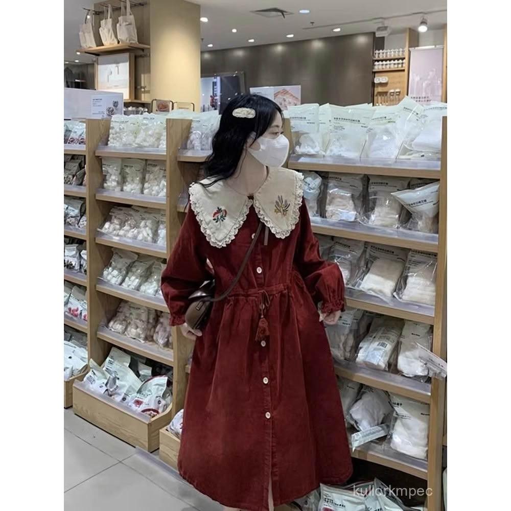 浩浩甄選 80-300斤法式燈芯絨娃娃領連衣裙秋冬新年戰袍刺繡花邊收腰中長裙