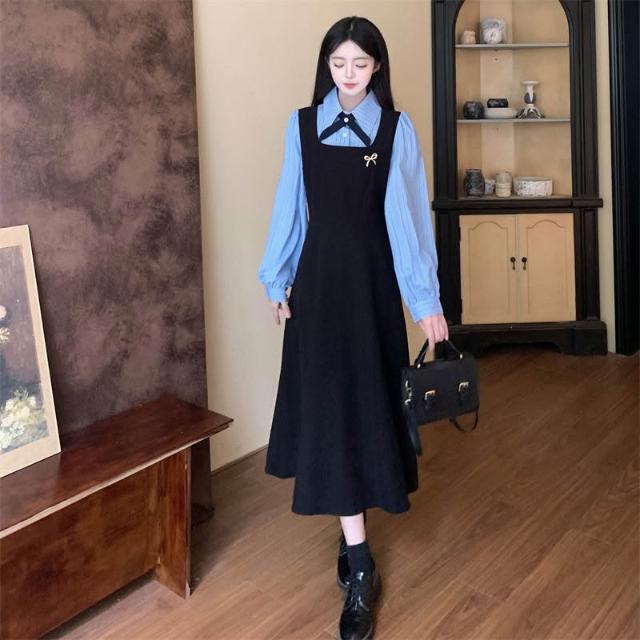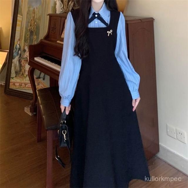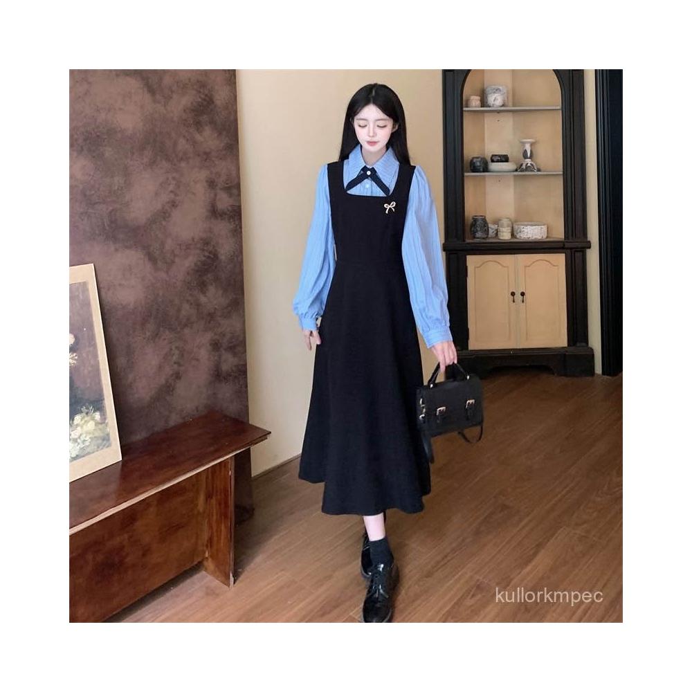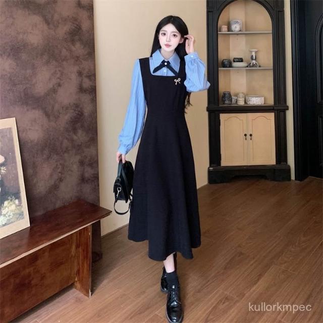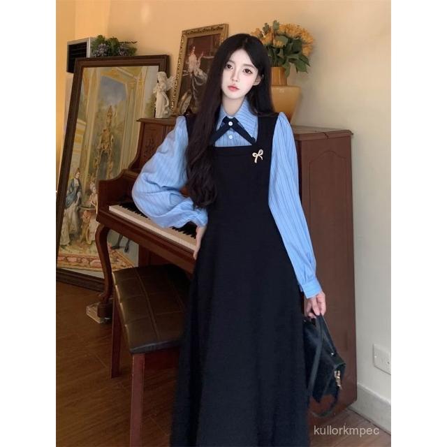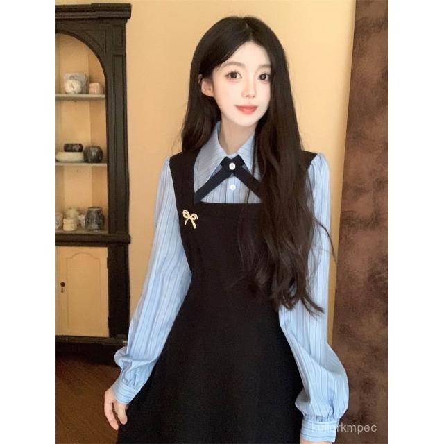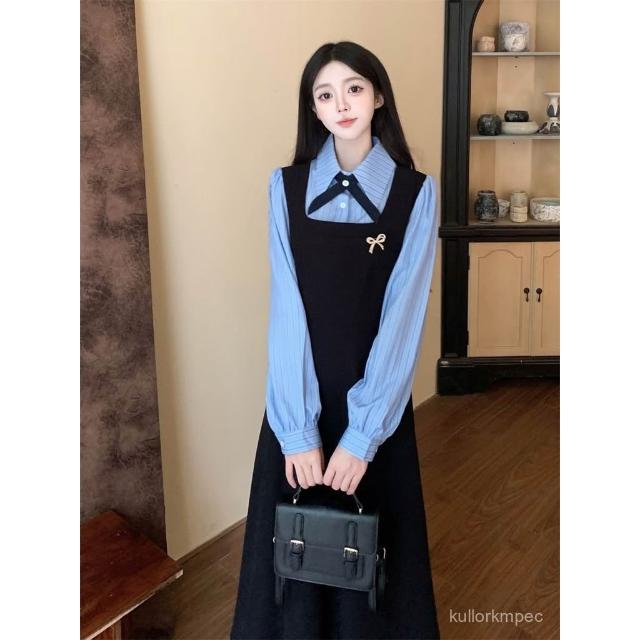 浩浩甄選 胖mm學院風設計感撞色條紋假兩件連衣裙2024秋冬收腰顯瘦百搭長裙