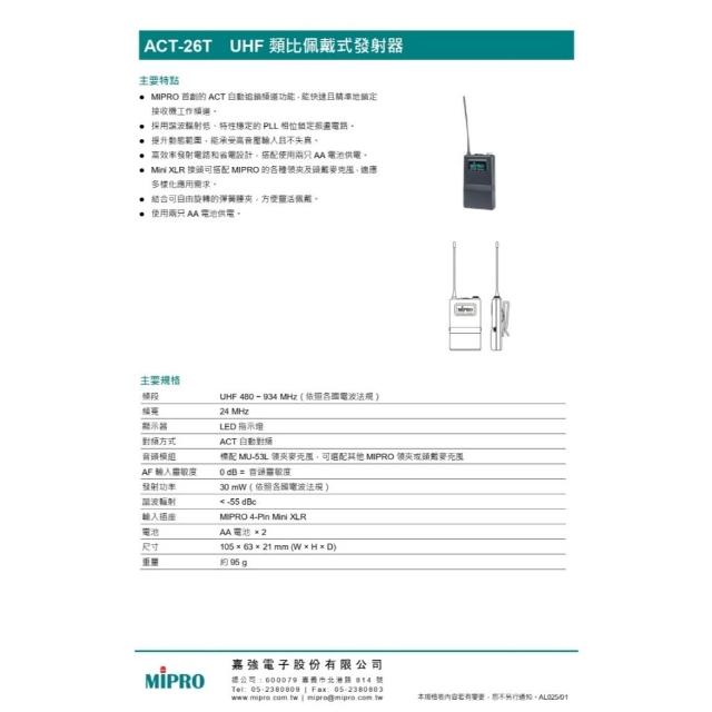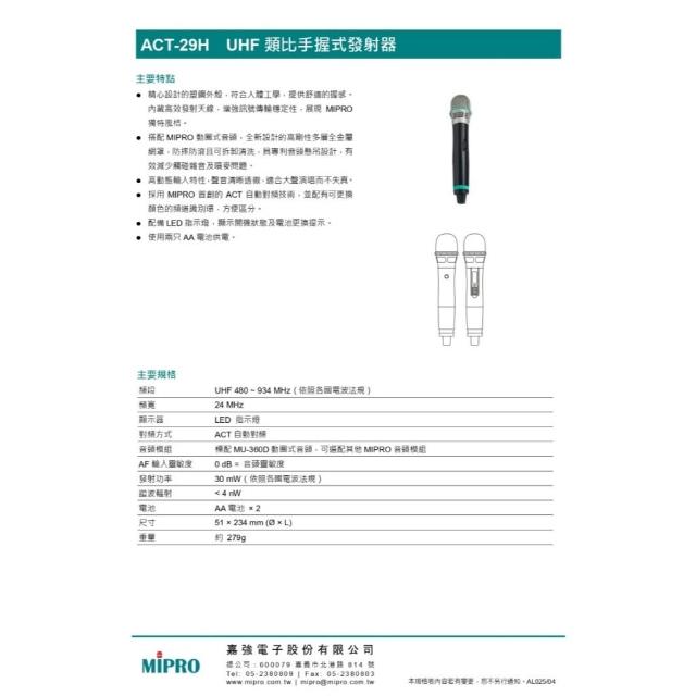 MIPRO麥克風 MIPRO ACT-229 搭配ACT-29發射器 新款卡拉OK動圈音頭無線麥克風/音響設備