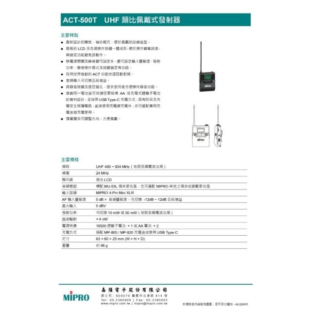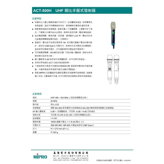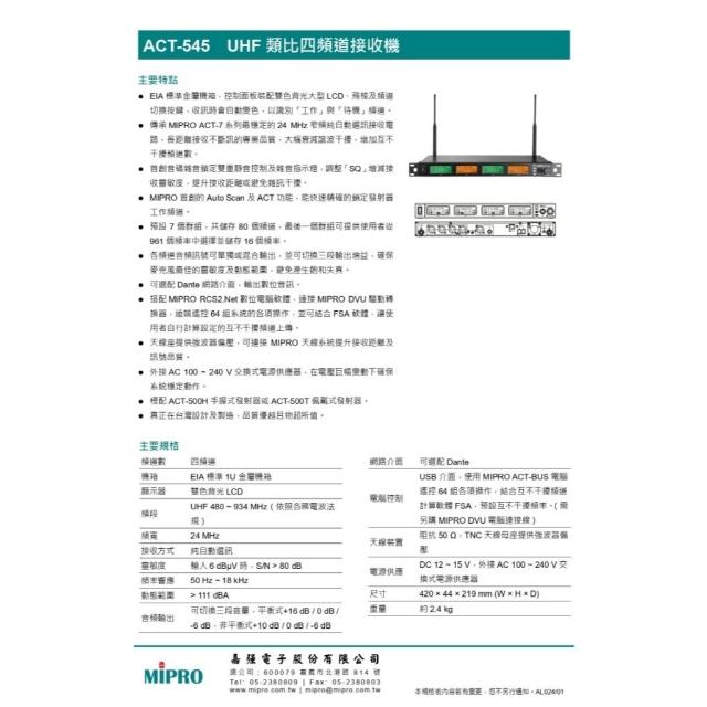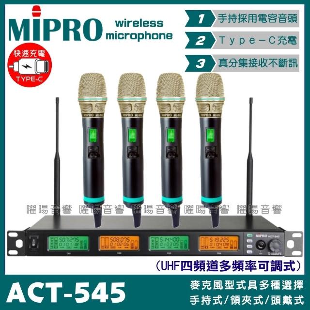 MIPRO麥克風 MIPRO ACT-545 搭配ACT-500H Type-C充電式發射器 四頻UHF無線麥克風/音響設備