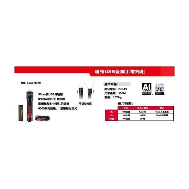 Milwaukee 美沃奇南慶五金 含稅 美沃奇 MILWAUKEE 米沃奇 隨身USB金屬聚光手電筒組L4TMLED-201 L4 TMLED