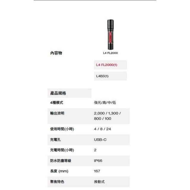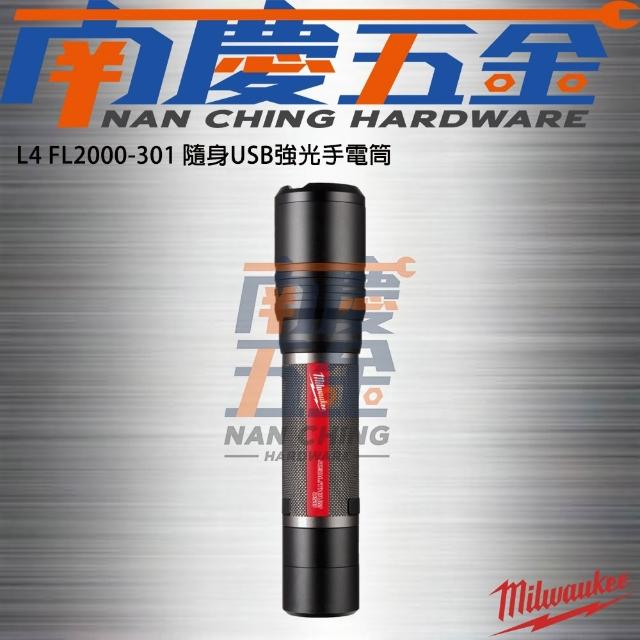Milwaukee 美沃奇南慶五金 含稅 美沃奇 MILWAUKEE 米沃奇 L4 FL2000-301 隨身USB強光手電筒 L4FL2000-