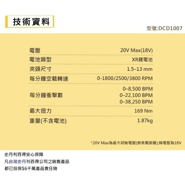 DEWALT 得偉南慶五金 公司貨 含稅 德偉 得偉 DEWALT DEWALT DCD1007 強力型震動電鑽 無刷電鑽 震動電鑽