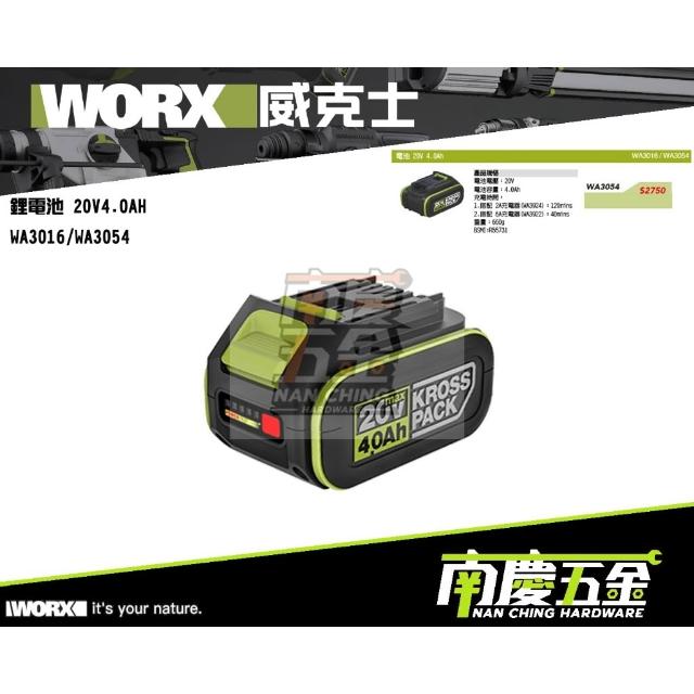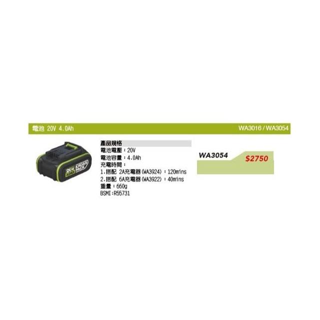 WORX 威克士南慶五金 含稅 公司貨 WORX威克士 原廠 鋰電池 20V4.0AH WA3016/WA3054