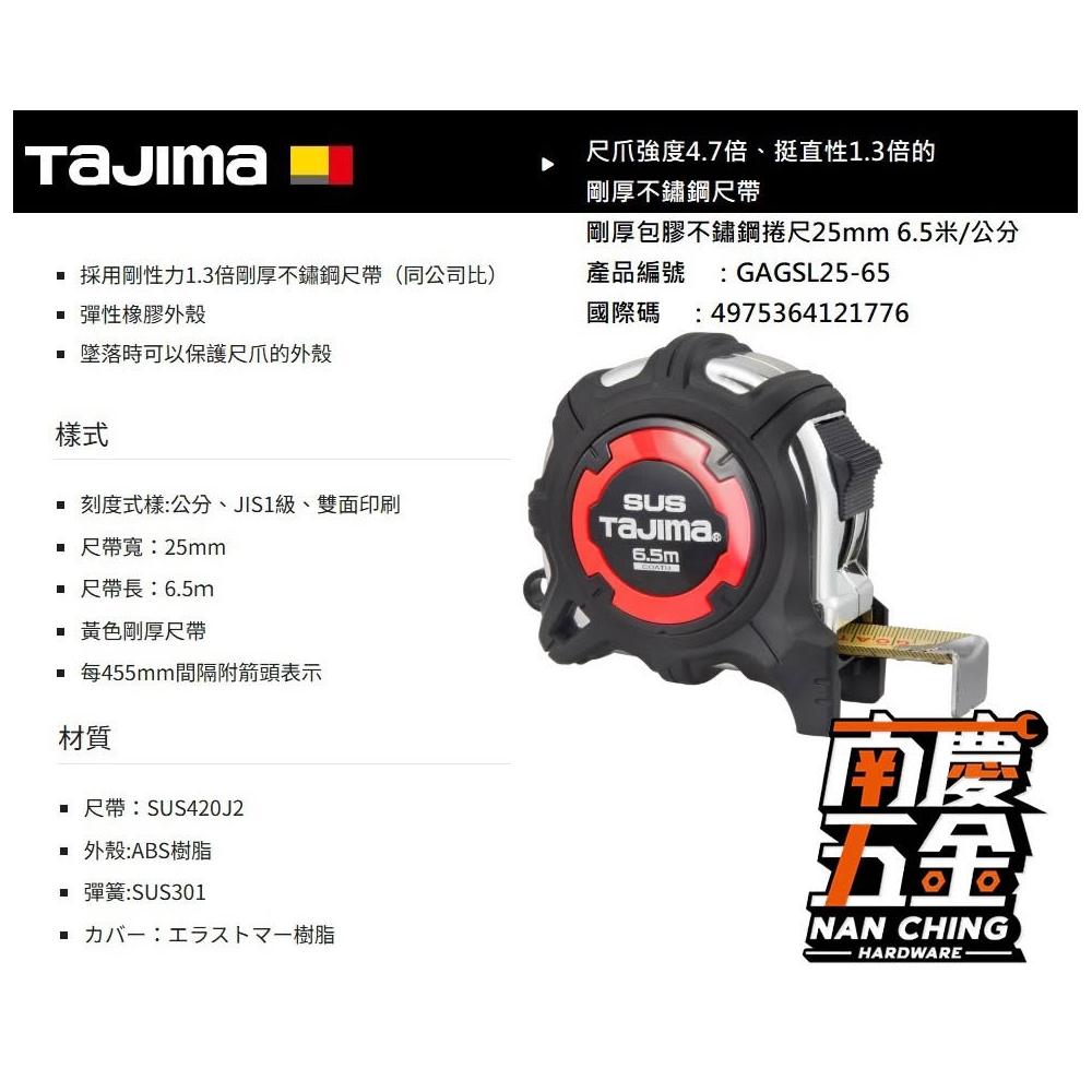 Tajima 田島南慶五金 含稅 日本 田島 TAJIMA 剛厚包膠不鏽鋼捲尺25mm 6.5米/公分 GAGSL25-65