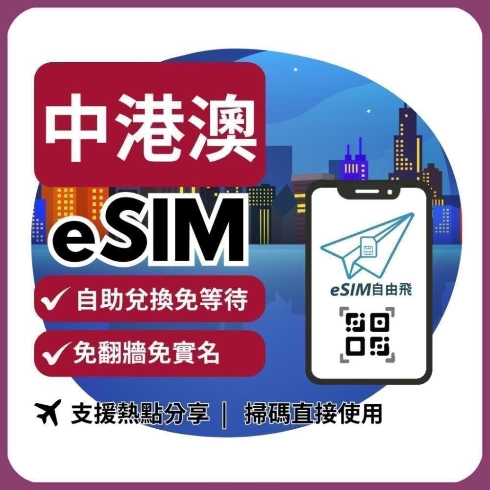 eSIM FlyeSIM自由飛 中港澳eSIM|中國免翻牆 24H發貨五分鐘取件 三地通用 網卡 吃到飽 香港澳門大陸 esim中國