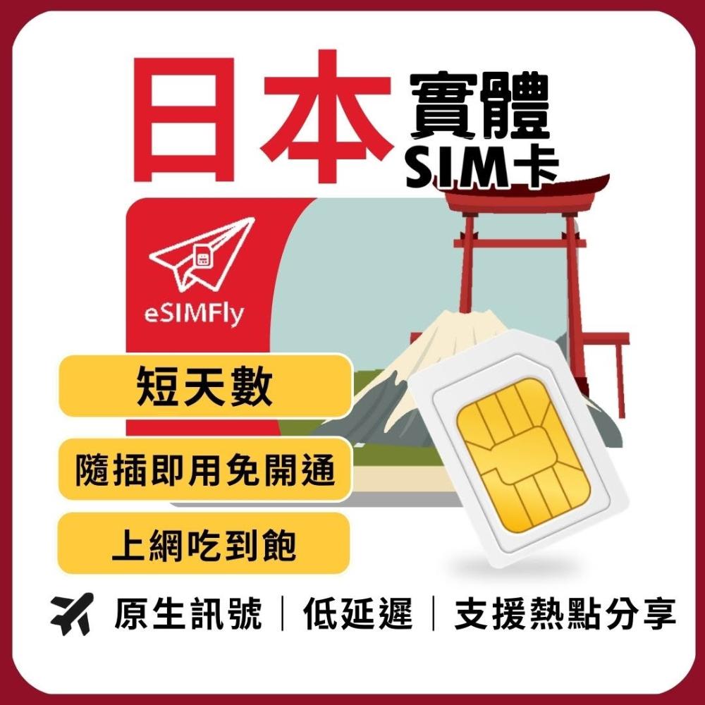 eSIM Fly日本 實體SIM卡| 原生DOCOMO/軟銀 吃到飽 即插即用 日本 東京 大阪 北海道 沖繩sim卡【短天數】
