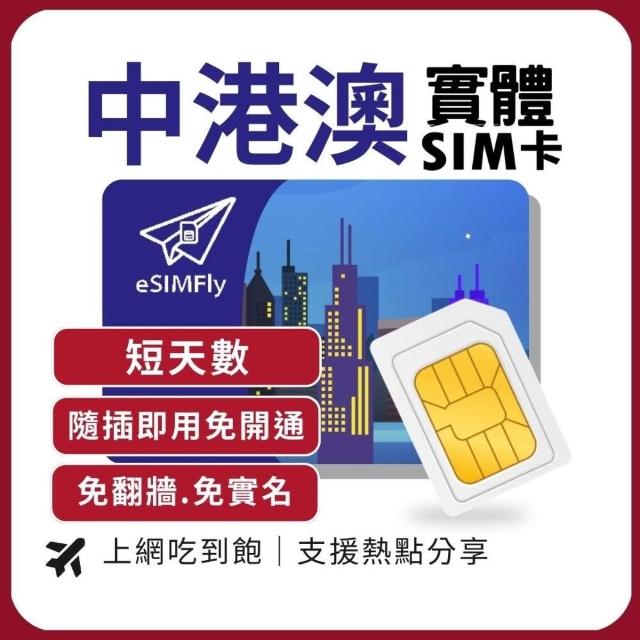 eSIM Fly中港澳 實體SIM卡| 吃到飽 5G/4G高速 免翻牆 3~8天 隨插即用 中國 澳門 香港網卡【短天數】