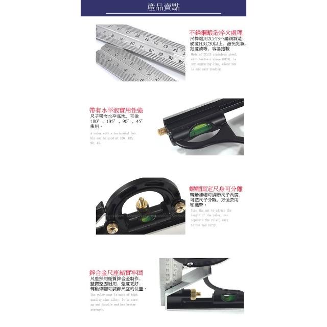 組合角尺- 多功能組合30cm角尺 不鏽鋼水平尺 直角尺 45度三角尺 180度圓規尺☆