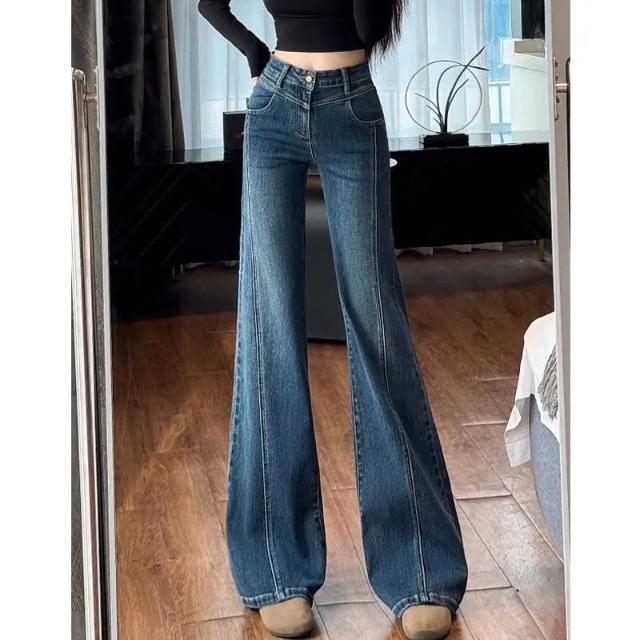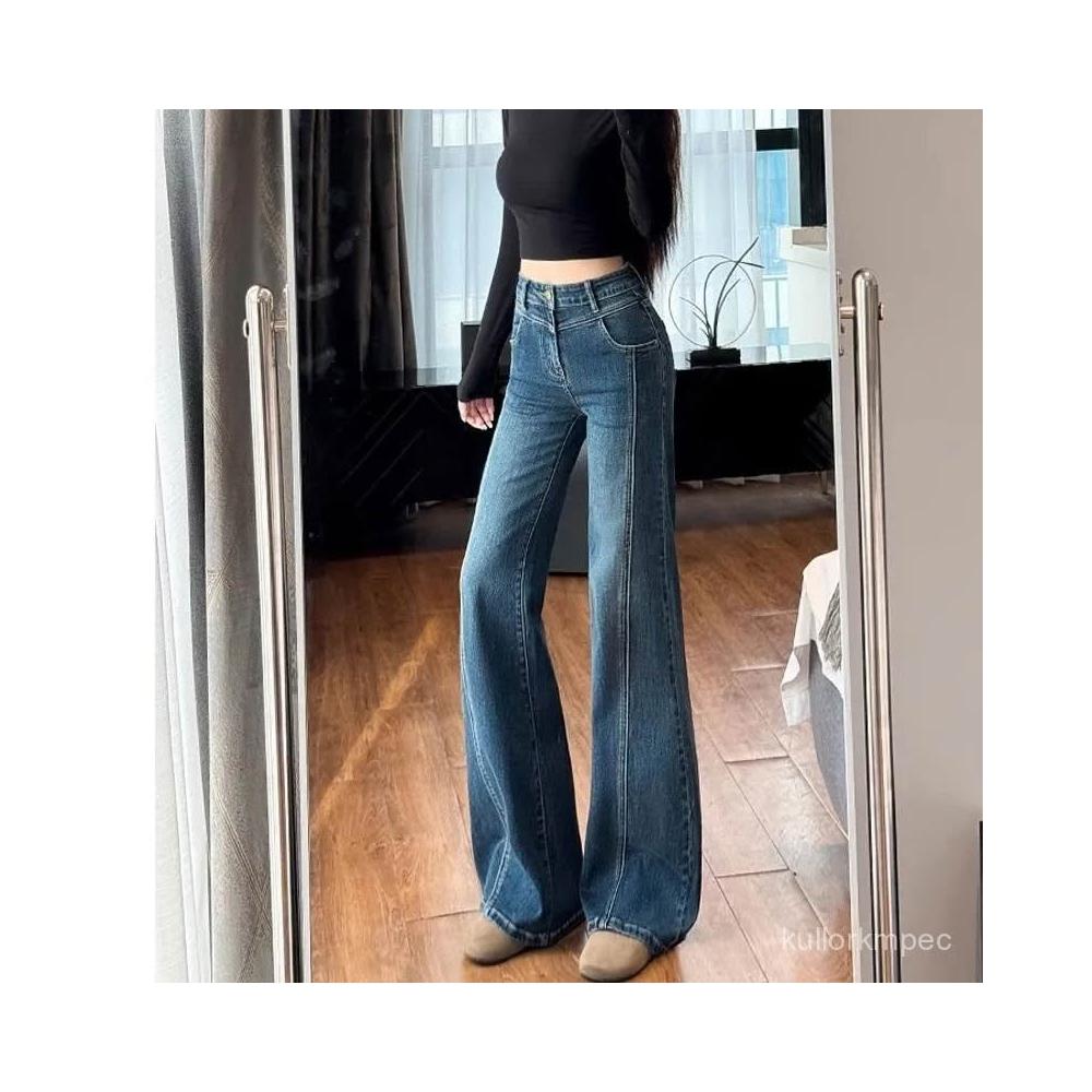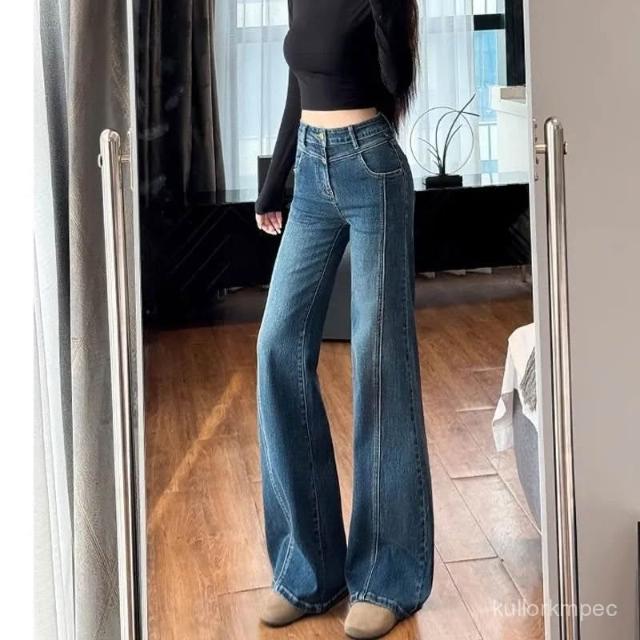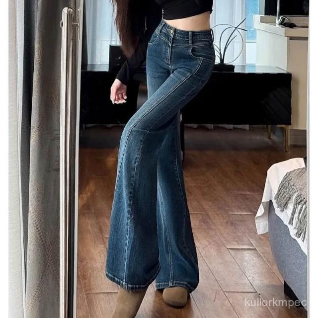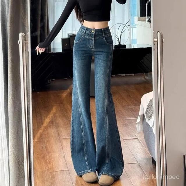 Aimeelu小個子做舊微喇牛仔褲女 高腰顯瘦彈力寬鬆闊腿喇叭褲拖地長褲 牛仔褲