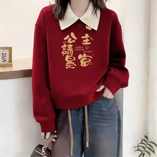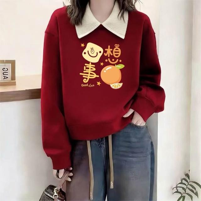 2026本命年馬年衣服 新款過年酒紅色翻領衛衣女新年加絨外套 女裝衣服 上衣套裝