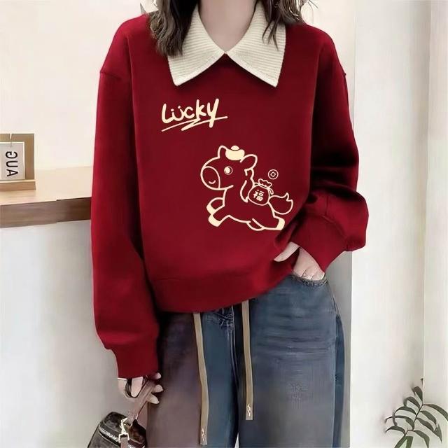 2026本命年馬年衣服 新款過年酒紅色翻領衛衣女新年加絨外套 女裝衣服 上衣套裝