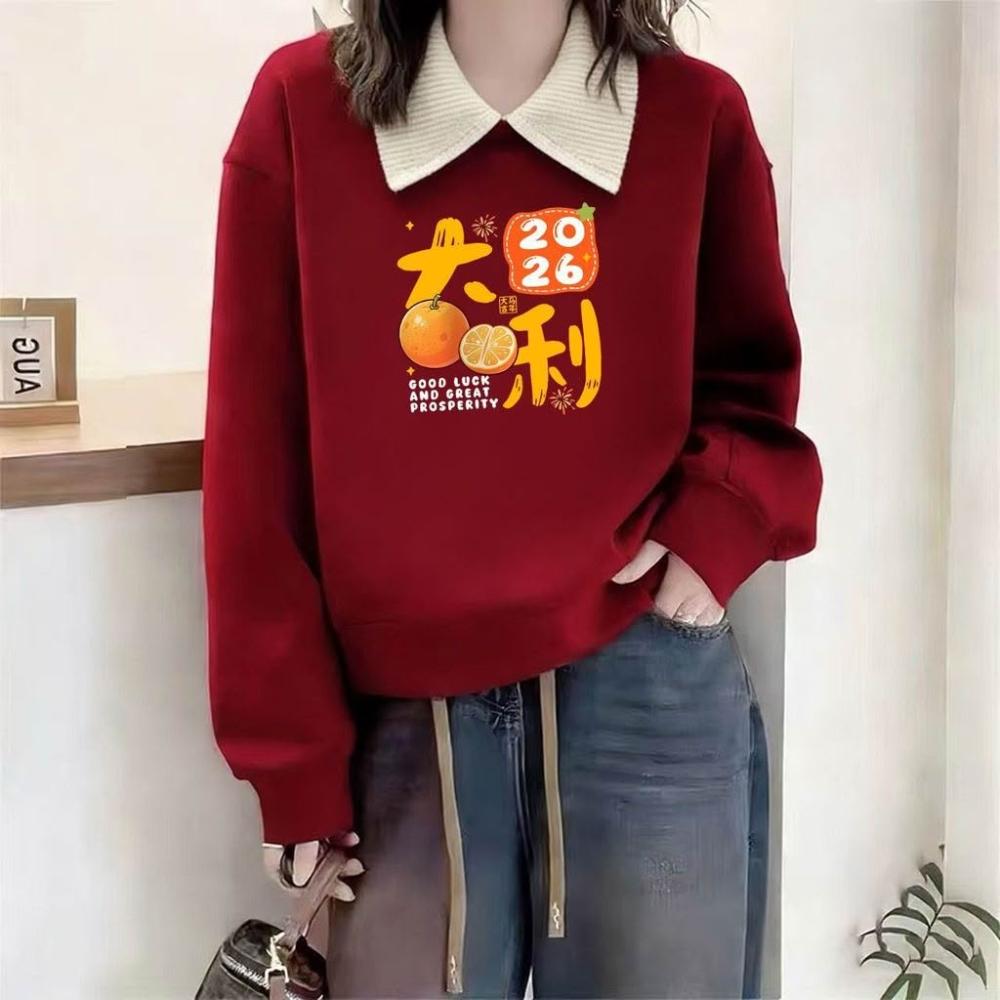 2026本命年馬年衣服 新款過年酒紅色翻領衛衣女新年加絨外套 女裝衣服 上衣套裝