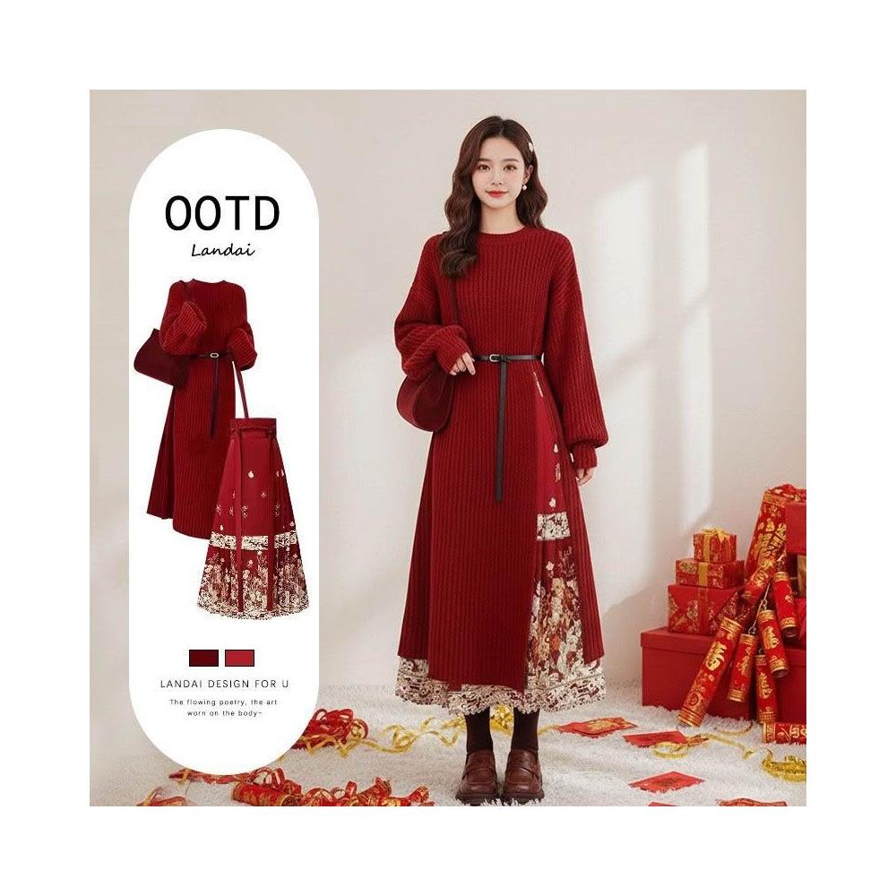 Aimeelu新年戰袍新中式國風紅色馬面裙女 冬季聖誕穿搭開叉針織毛衣連衣裙 女裝毛衣連衣裙套裝 年貨