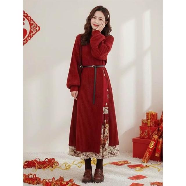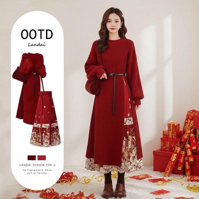 Aimeelu新年戰袍新中式國風紅色馬面裙女 冬季聖誕穿搭開叉針織毛衣連衣裙 女裝毛衣連衣裙套裝 年貨