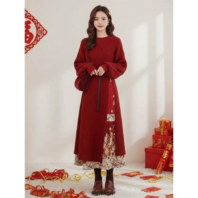 Aimeelu新年戰袍新中式國風紅色馬面裙女 冬季聖誕穿搭開叉針織毛衣連衣裙 女裝毛衣連衣裙套裝 年貨