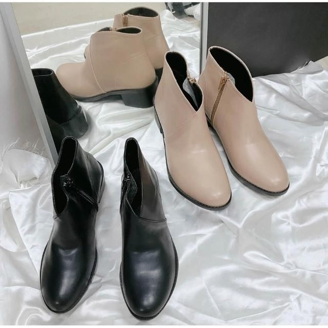 Uneed前V口裸靴 舒適斜口靴 粗跟短靴 MIT素面短靴 裸色 黑靴